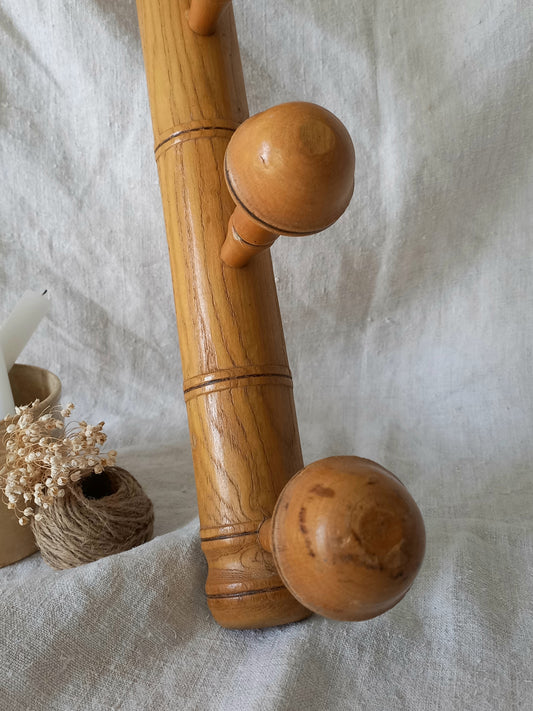 French Vintage Wooden Faux Bamboo Coat Rack with 4 Pegs