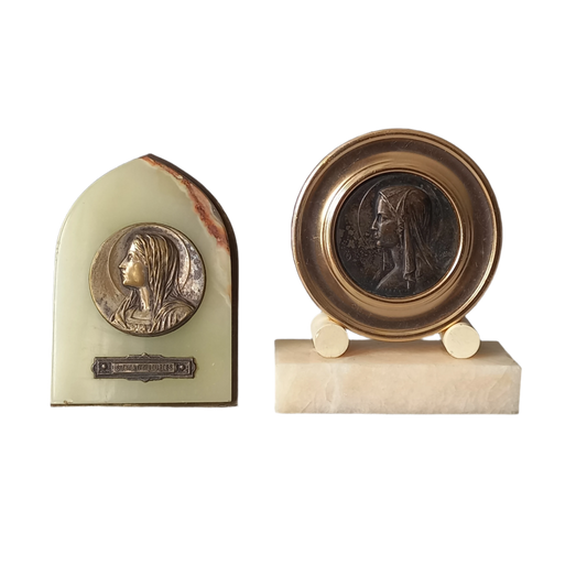 Pair French vintage religious souvenirs, Virgin Mary medals, decorative French vintage religious desk ornaments
