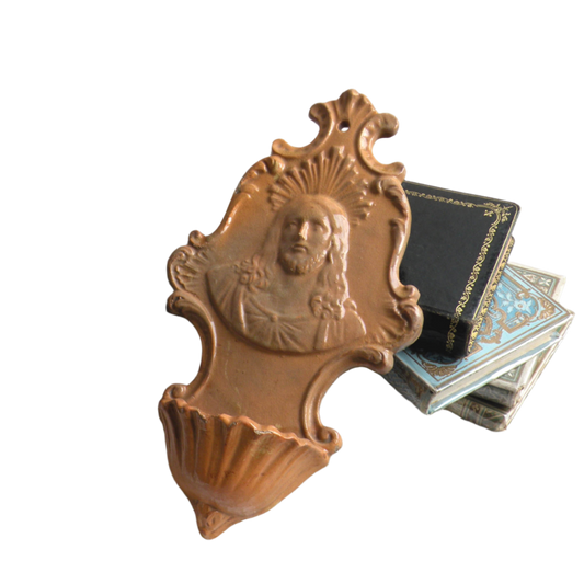 Vintage Holy Water stoup with metal crucifix and religious figures