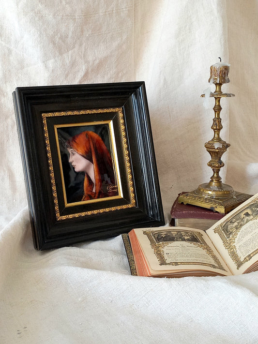 French Vintage Religious Saint Fabiola Enamel Portrait Painting in Frame by Limoges