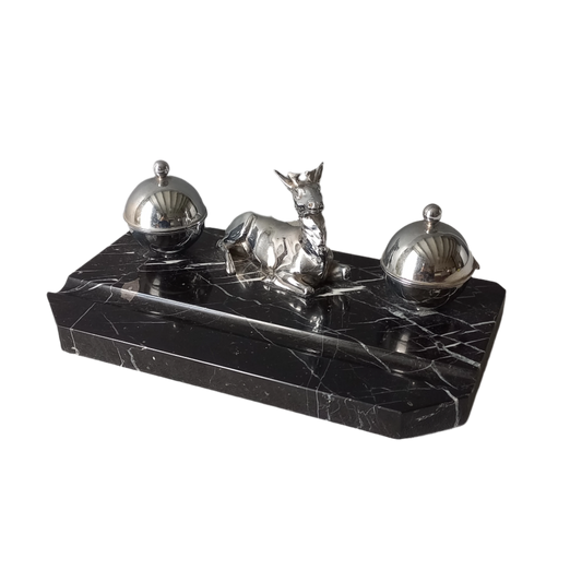 Encrier double vintage français avec figurine de cerf, décor de bureau art déco faon