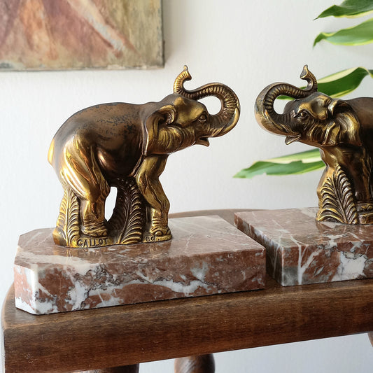 Vintage Elephant Bookends, Bronze Colour Elephants On Marble Bases