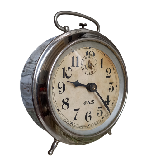 Petit réveil mécanique vintage de la société française Jaz avec boîtier chromé de couleur argent