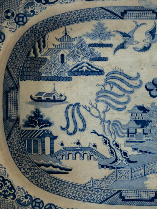 GRANDE assiette à viande antique en grès de fer marquée Staffordshire, saule bleu et blanc