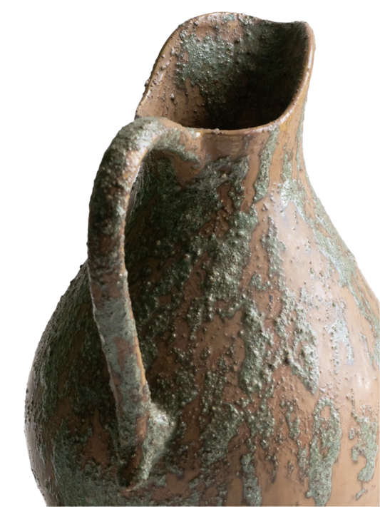 Pichet ou cruche en poterie vintage aux tons terreux et motif vert en relief