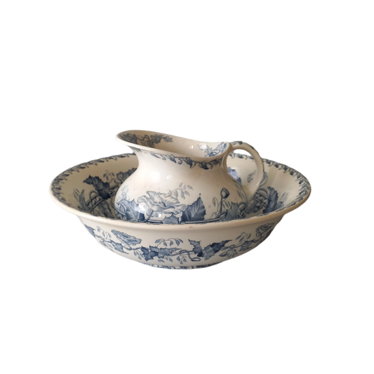 Service à vaisselle ancien en terre de fer à décor floral bleu, pichet et bol de Sarreguemines
