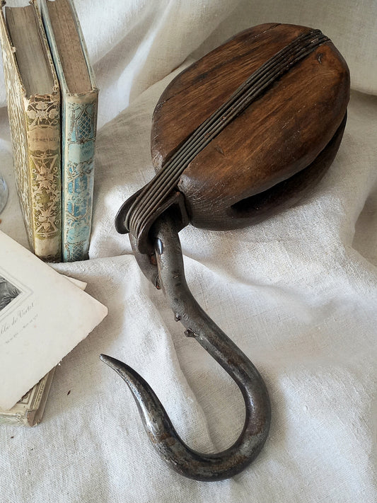 Poulie de bateau en bois vintage française pour décoration ou accessoire nautique