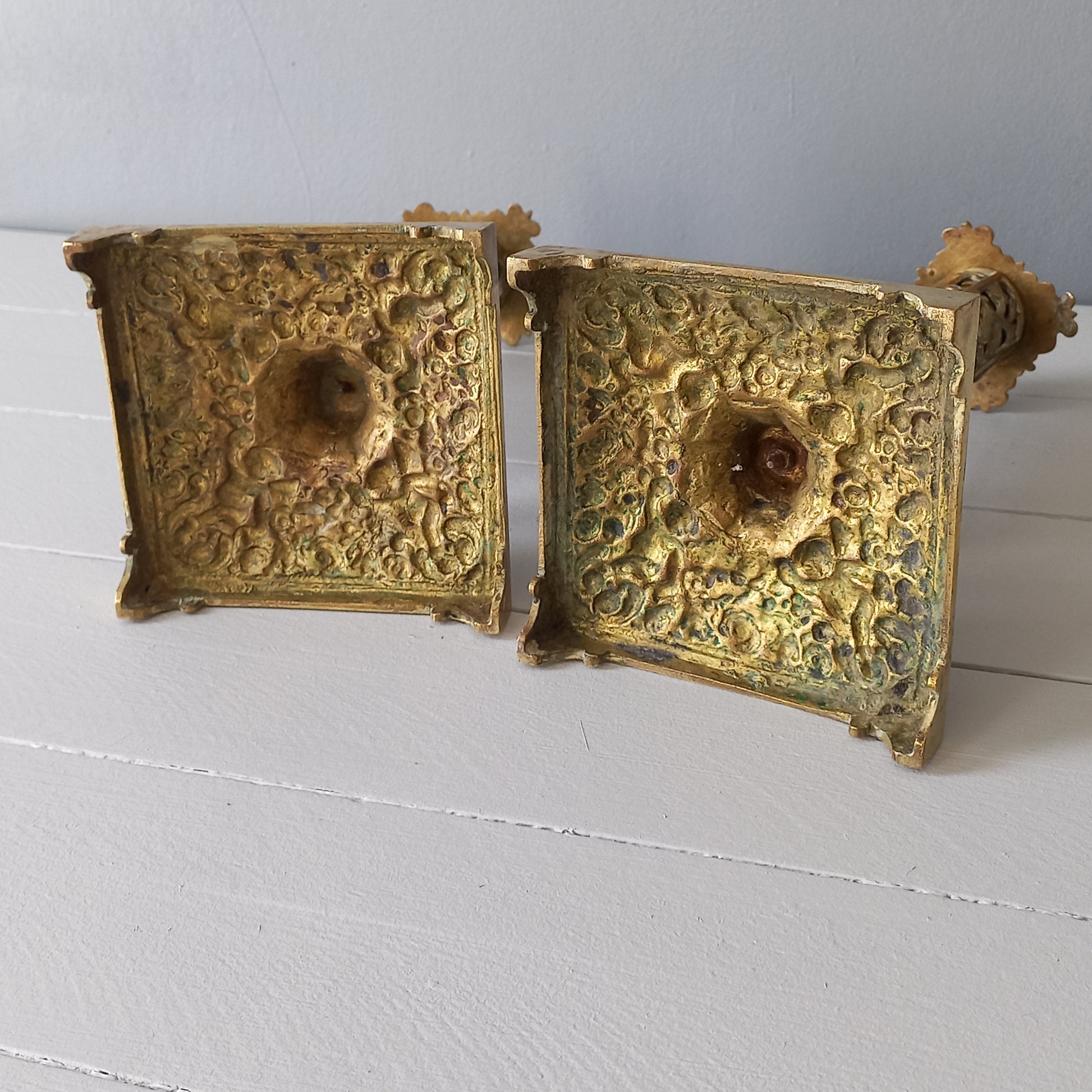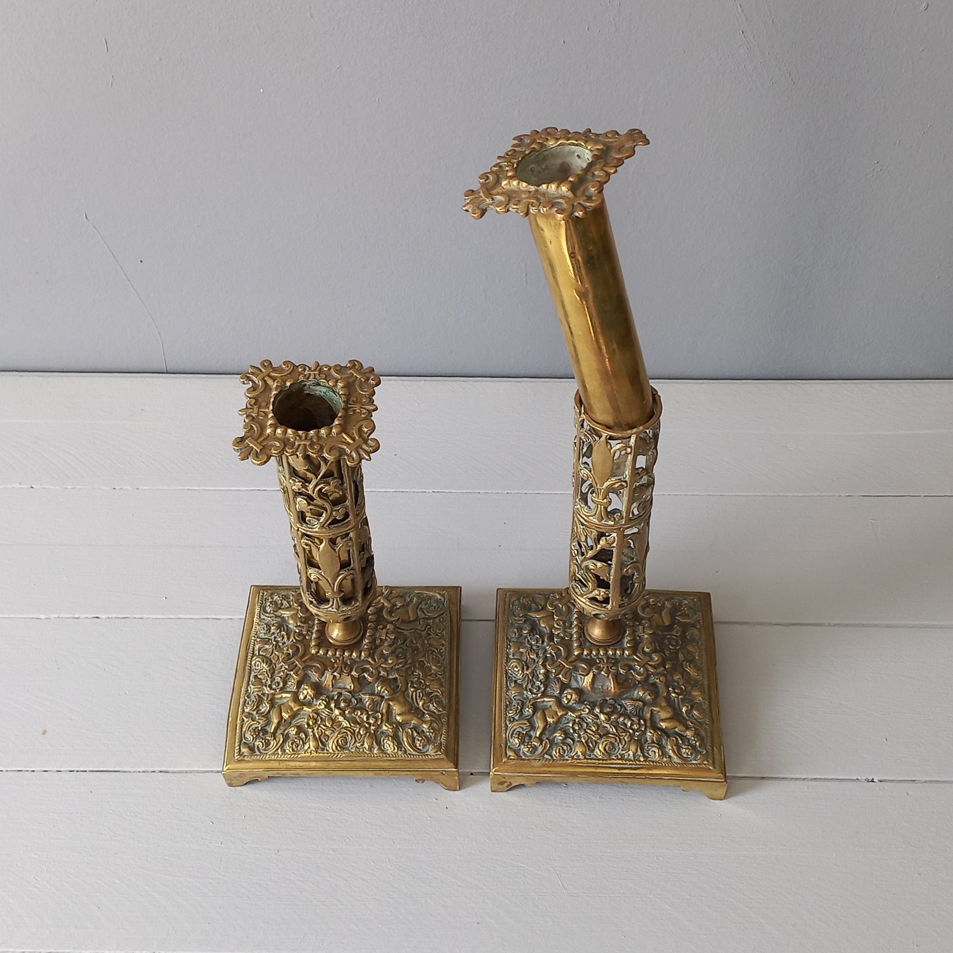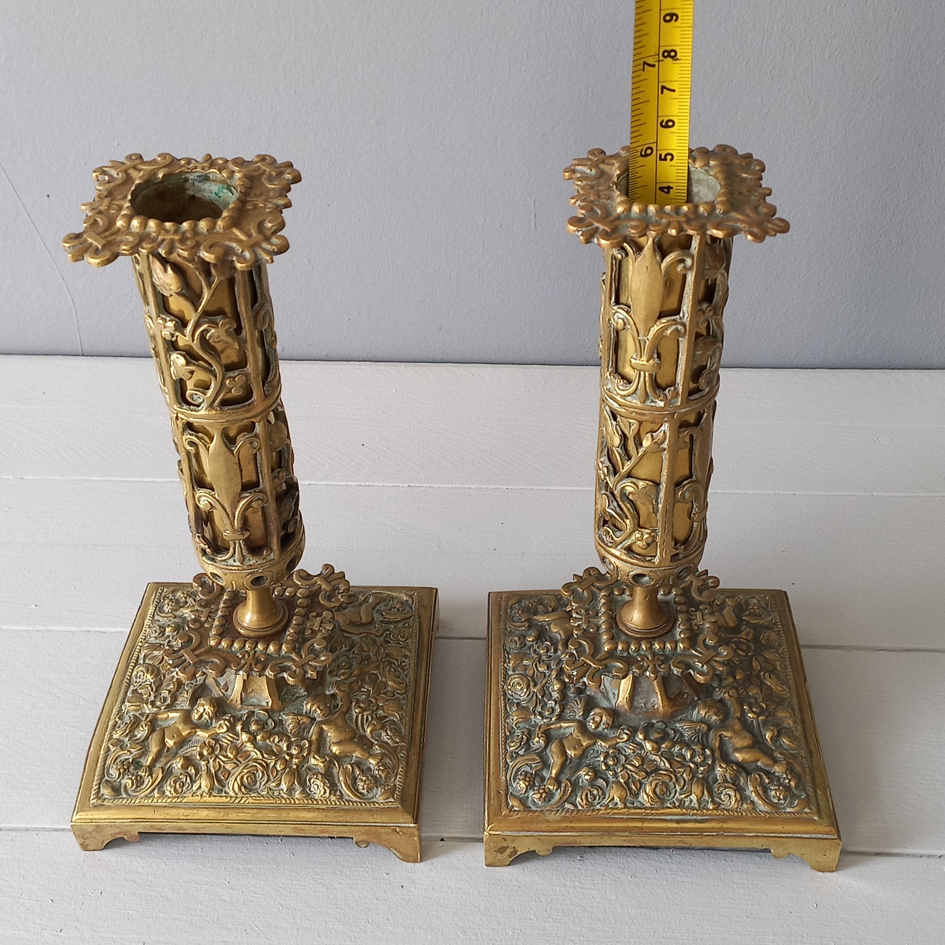 Superbe paire de bougeoirs anciens en laiton, achetés en France. Fabriqués à la main, ces bougeoirs sont ornés de détails fabuleux, comme les chérubins sur les bases. Un tube en laiton permet d'y placer vos bougies. Celles-ci devront être plus longues que la profondeur du tube (voir les photos avec le mètre ruban pour une idée). Veuillez consulter les dimensions et l'état ci-dessous.