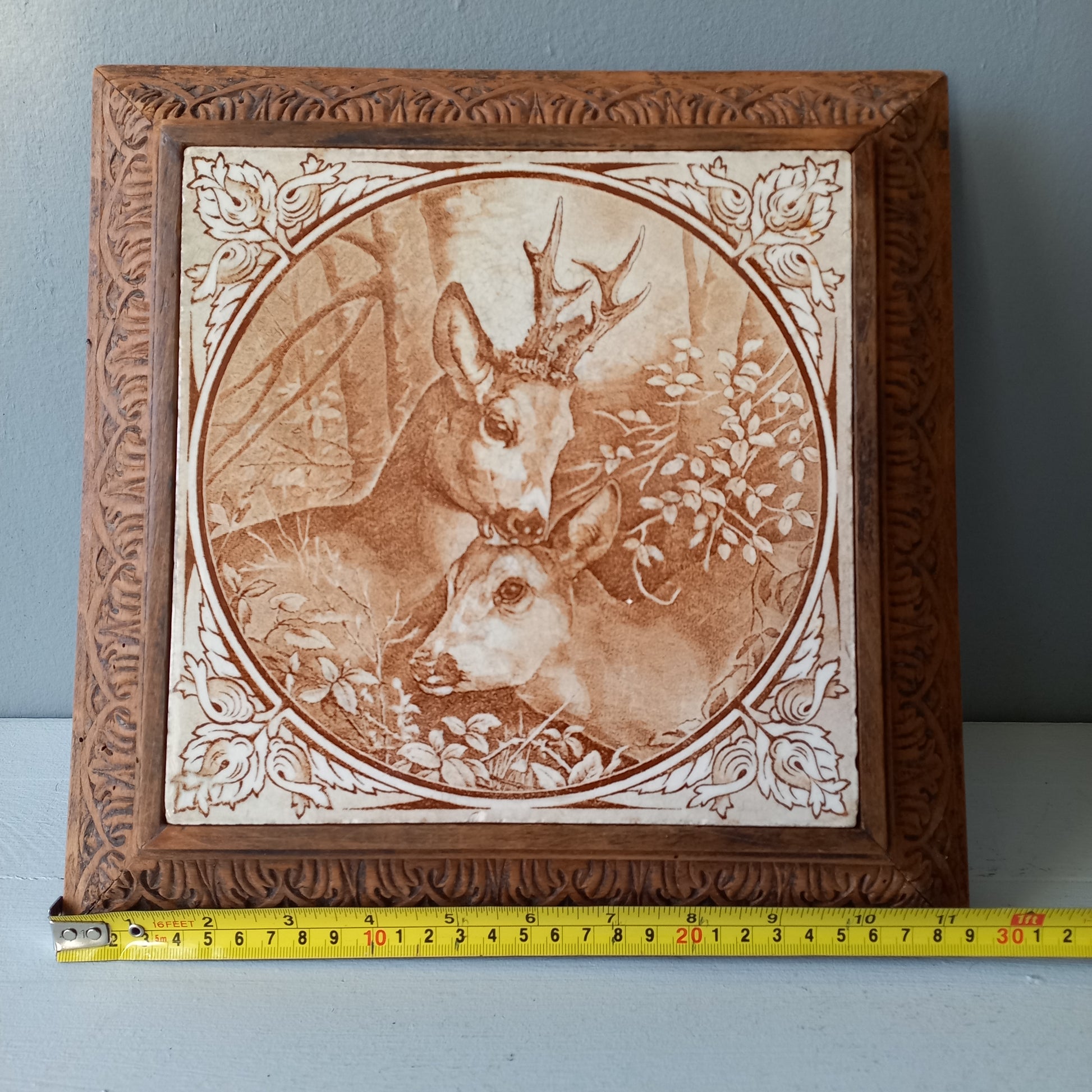 Dessous de plat en tuile de cerf antique, dessous de plat décoratif en forme de biche et de faon, grand carreau décoratif dans un cadre en bois sculpté