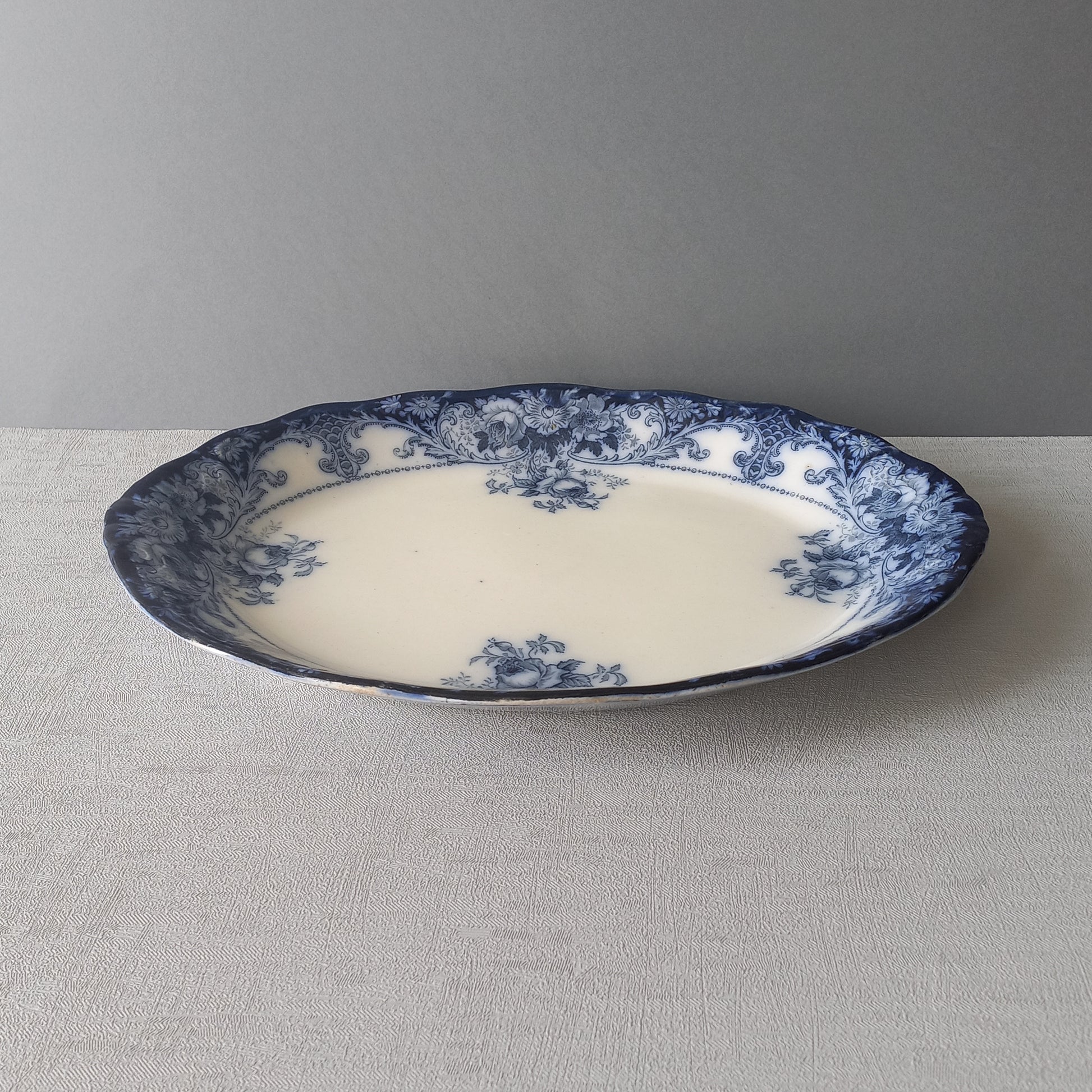 Description : Très belle assiette de service ovale anglaise ancienne en grès/semi-porcelaine, ornée d'un magnifique motif floral bleu foncé. Fabriquée par JHW & Sons.