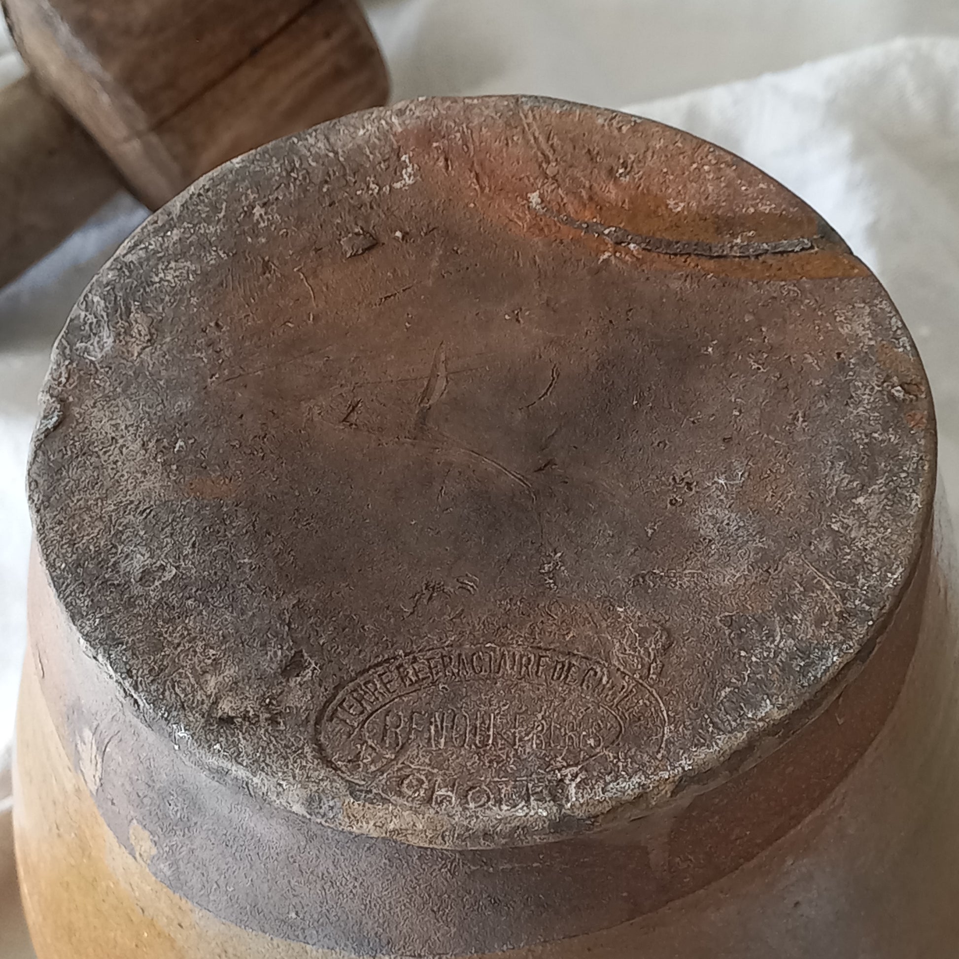 Pichet ou cruche en poterie vintage/antique avec une glaçure qui couvre la majeure partie de la surface extérieure et tout son intérieur. En dessous se trouve une marque de fabricant française (voir photos). Voir les dimensions et les détails de l'état ci-dessous.