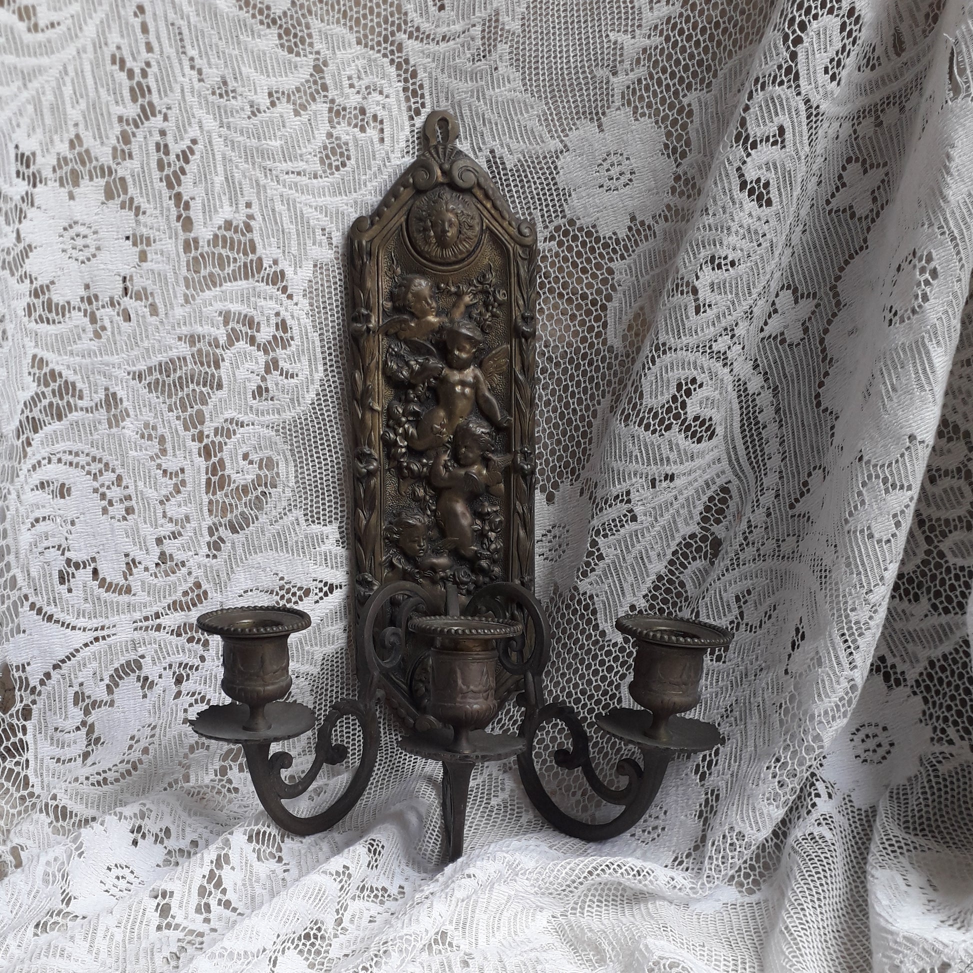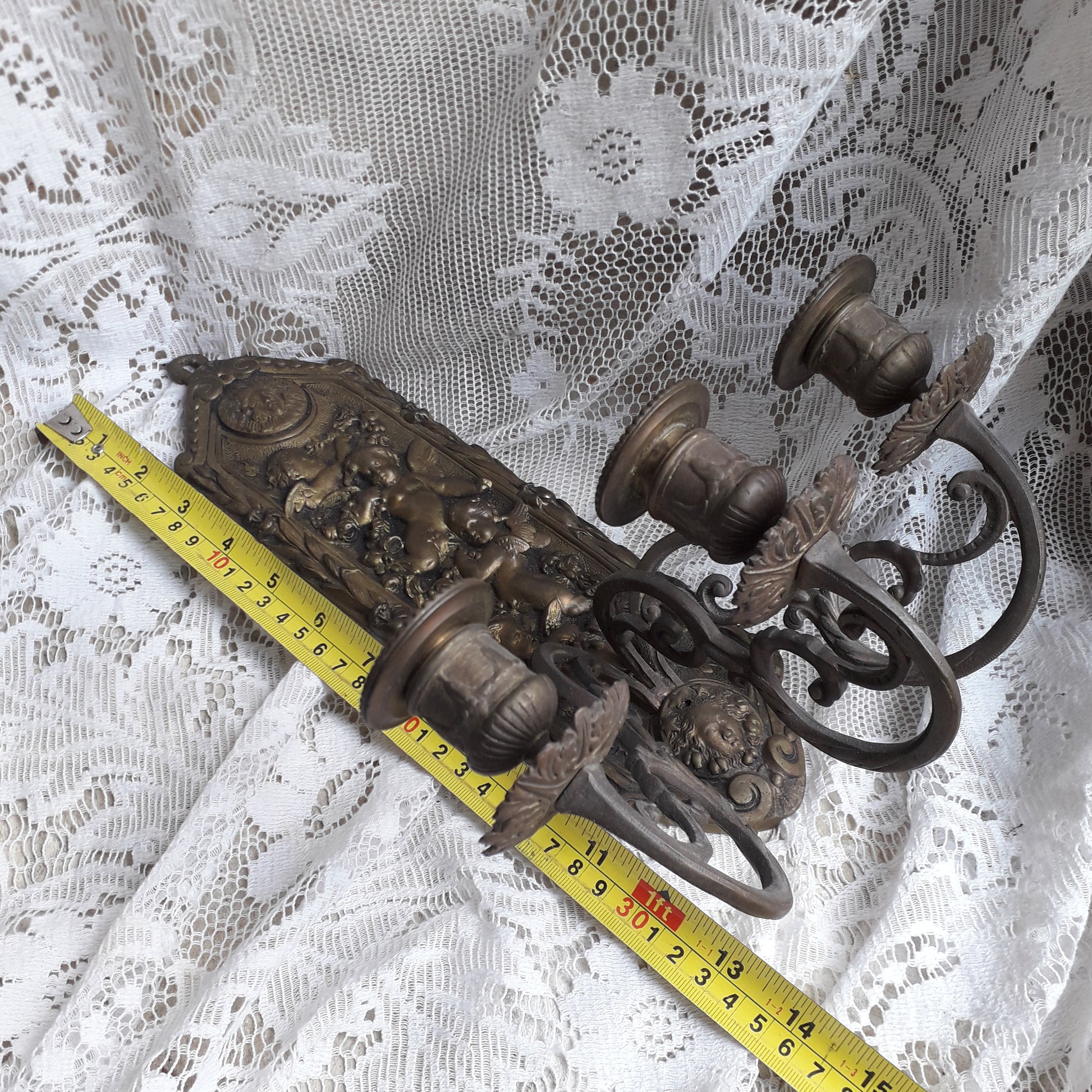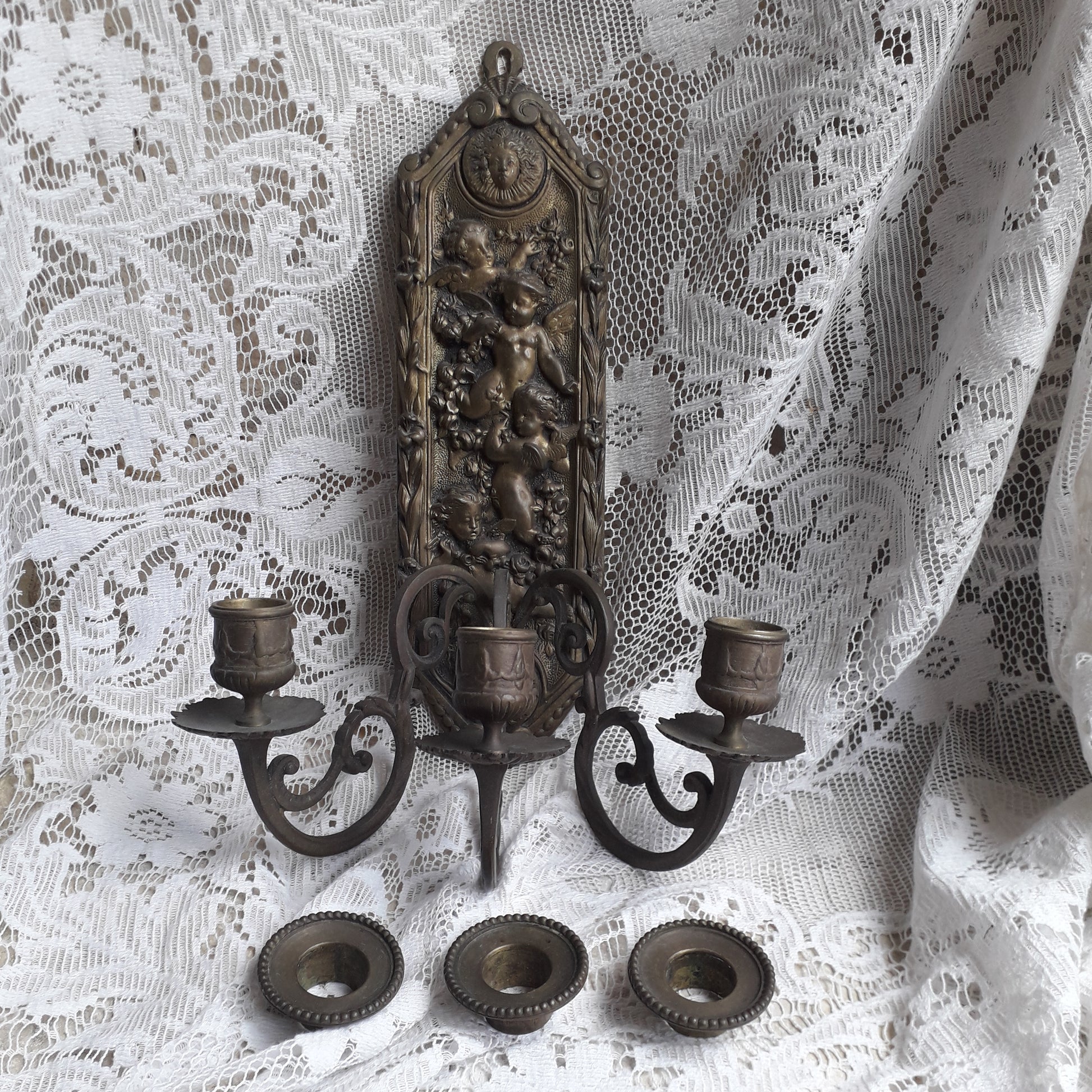 Une superbe applique murale française ancienne, ornée d'angelots en relief. Cette magnifique pièce s'accroche au mur comme un tableau. Ce lourd bougeoir semble en bronze, notamment les plaques murales ornées d'angelots. Cependant, à en juger par les tiges des bougies, elles pourraient aussi être en laiton avec une finition bronze, ou un mélange de métaux. Nous ne les avons pas nettoyées, car nous adorons leur aspect actuel et pensons que d'autres le seront aussi.