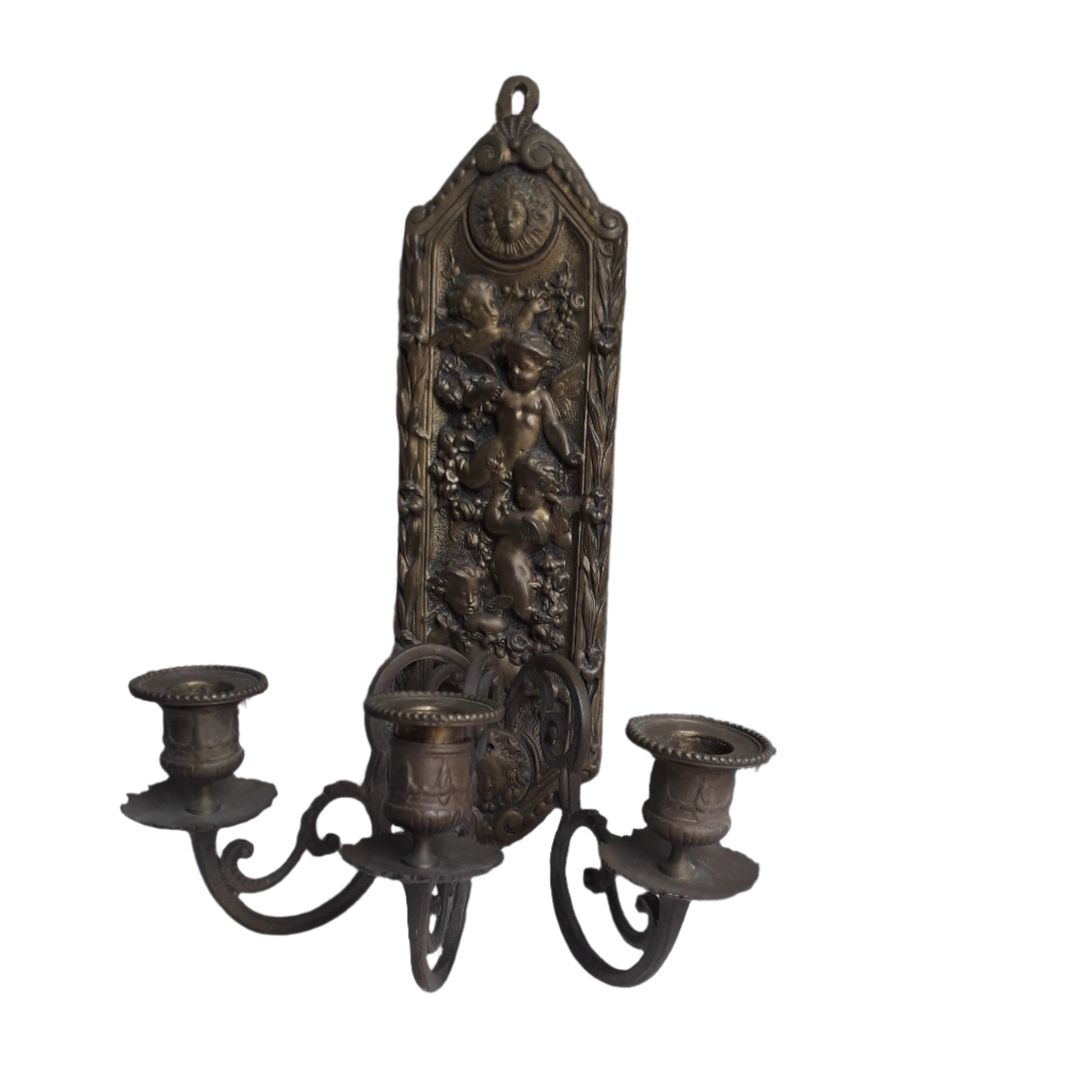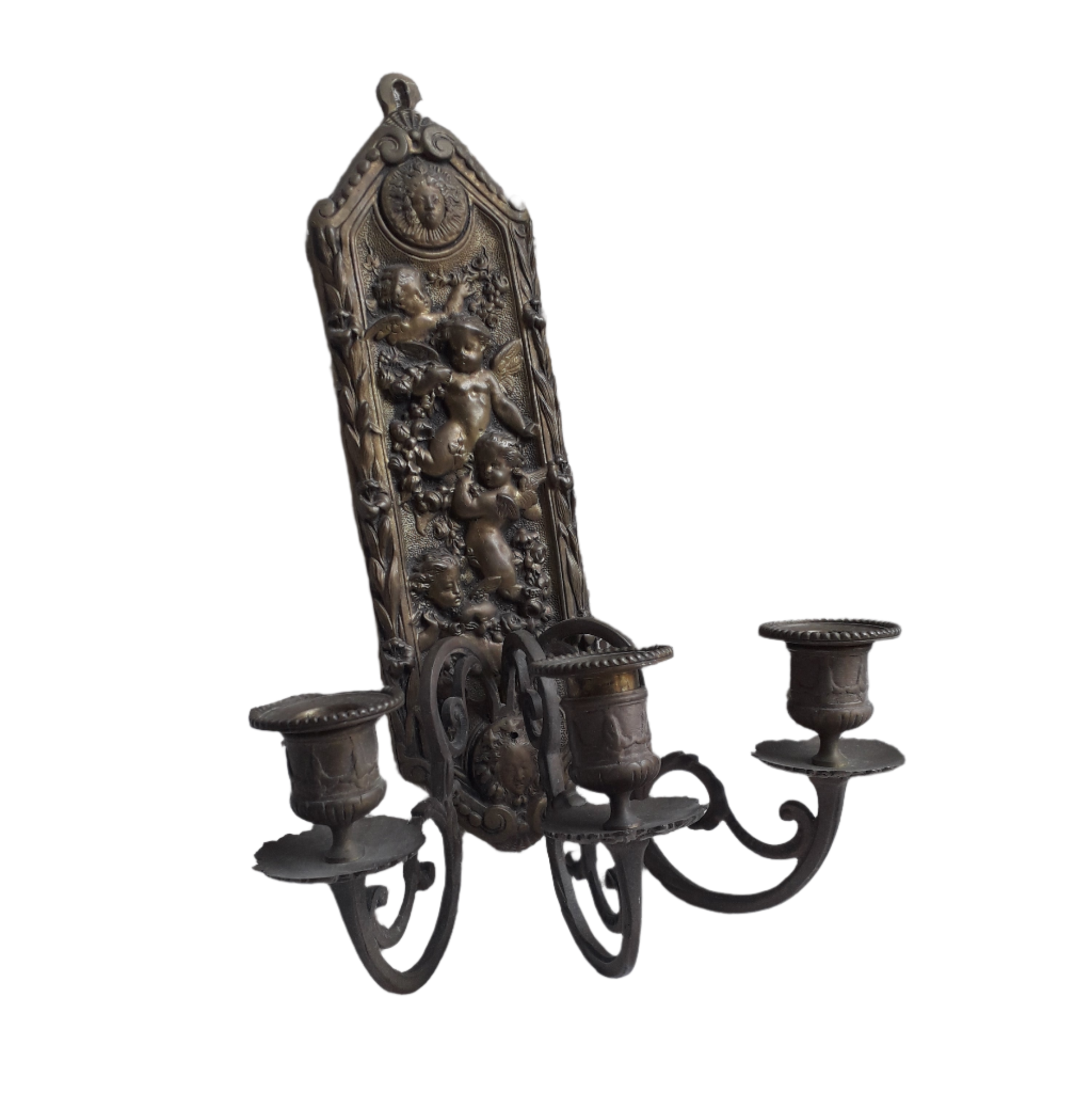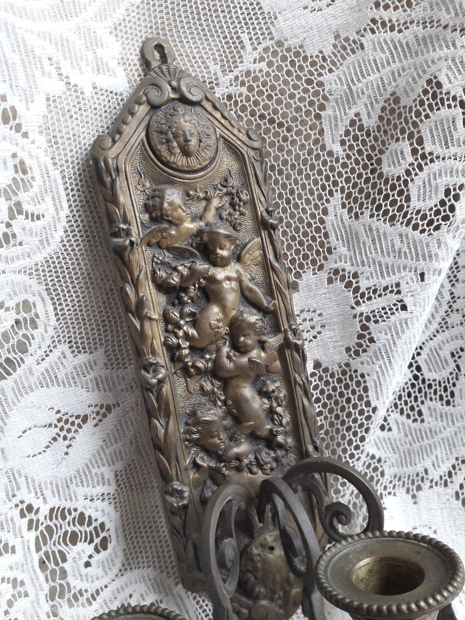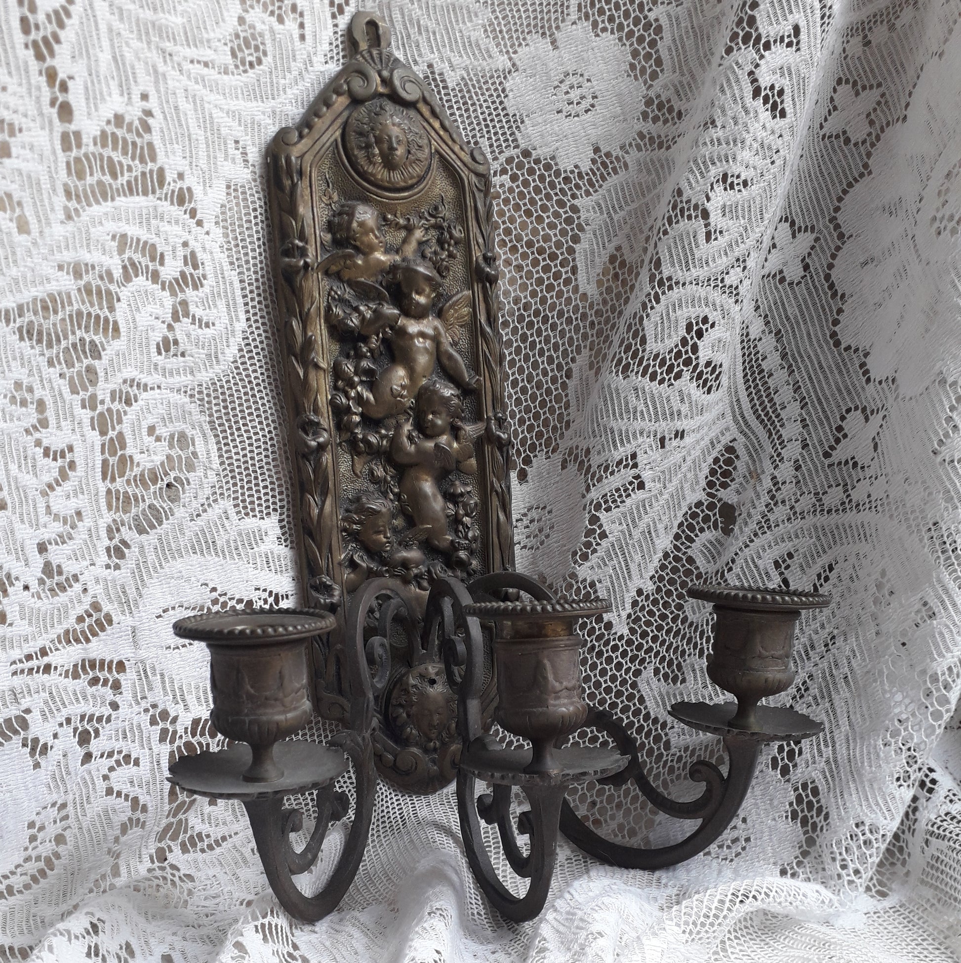 Bougeoir mural antique en bronze avec angelots, applique à bougie antique française