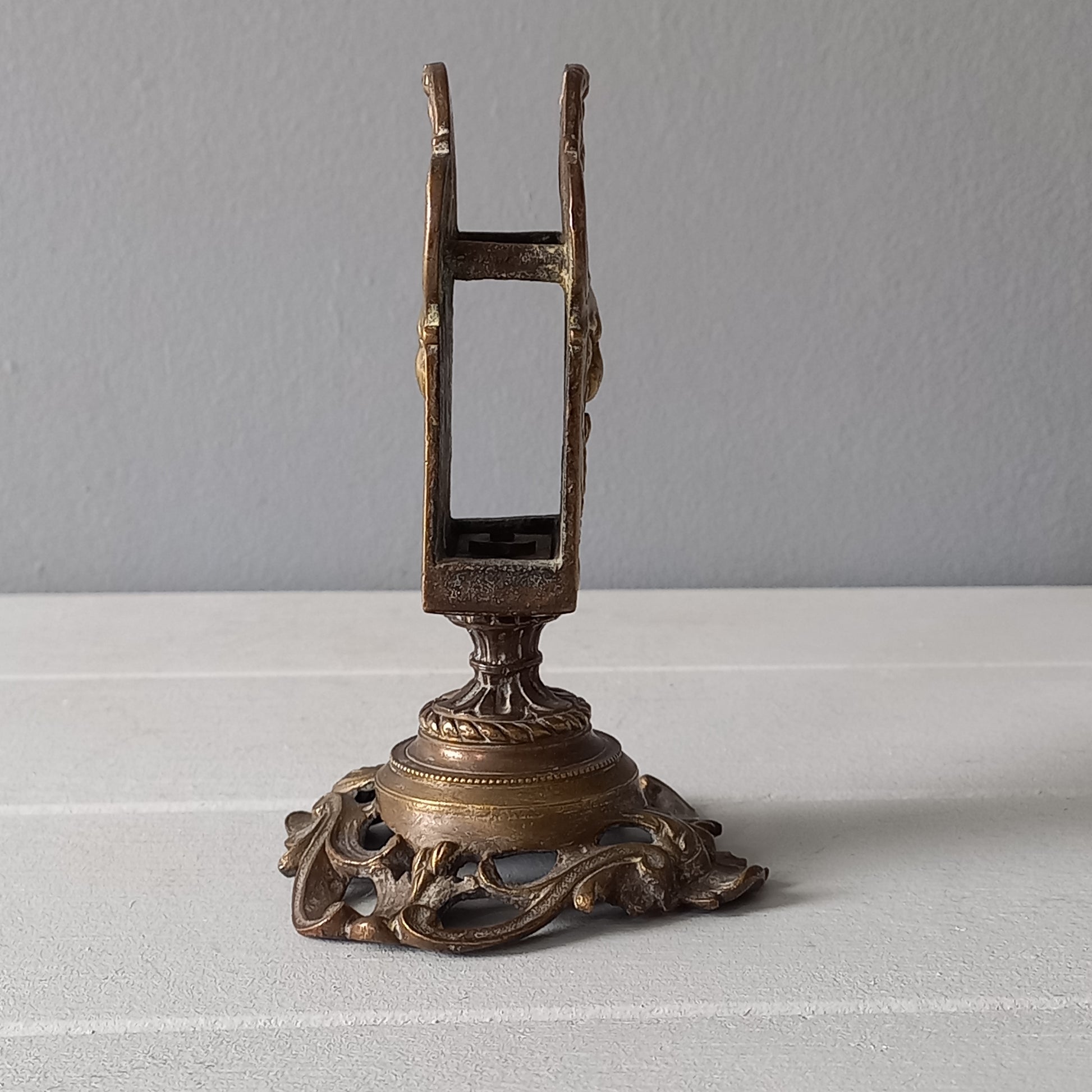Petit porte-allumettes ancien en laiton/bronze, fabriqué en France. Une pièce très décorative, étonnamment lourde pour sa taille. Ce précieux témoignage de l'histoire française est un excellent objet de décoration pour un bureau, une table ou une étagère. Remarque : à l'époque, les boîtes d'allumettes étaient plus petites.