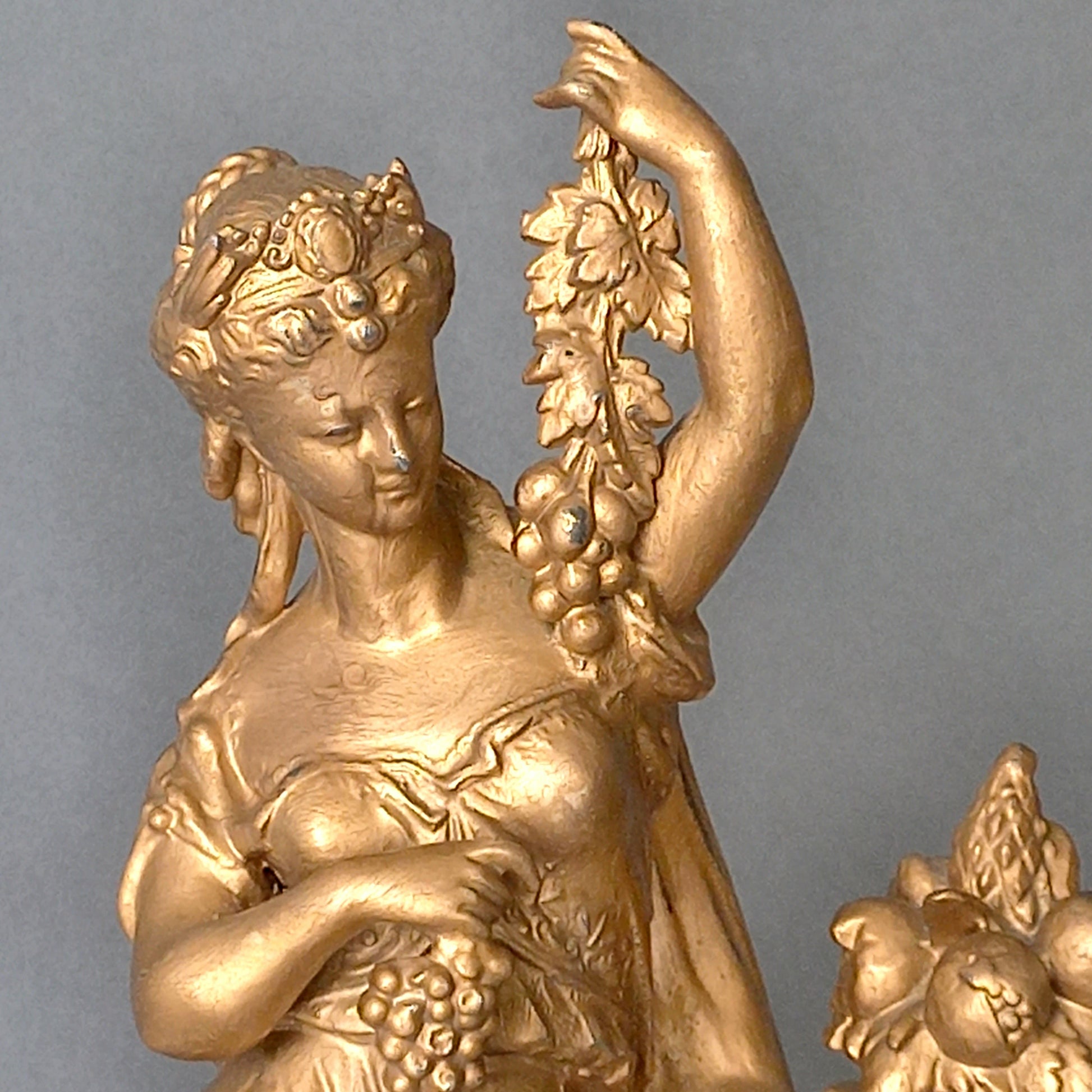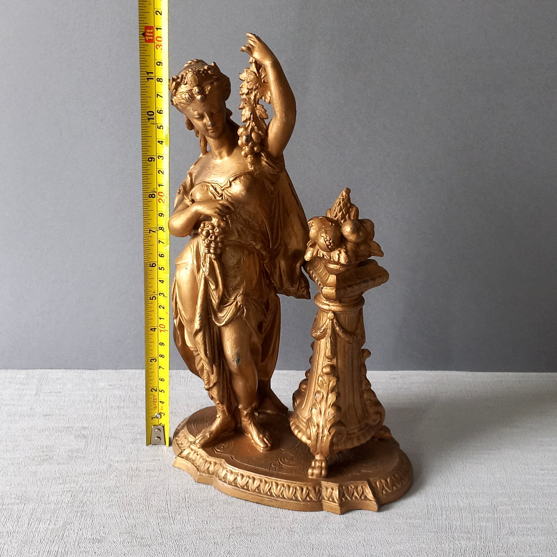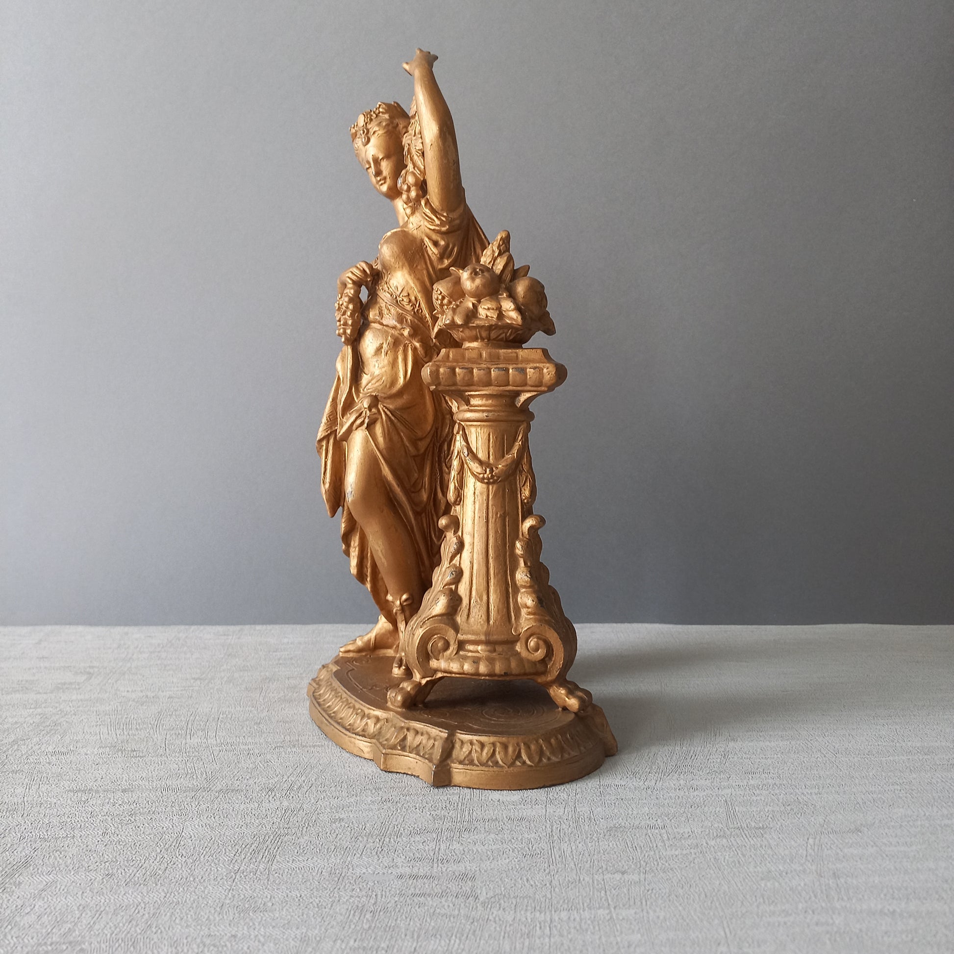 Grande statuette/figurine féminine antique française dans le style de l'art grec/romain classique - moulée dans un métal lourd et finie dans une couleur or/bronze, elle a vraiment l'air très spéciale. C'est une magnifique statuette ancienne qui a juste la bonne taille pour faire une véritable déclaration en tant que pièce de décoration intérieure, sans parler d'une magnifique œuvre d'art.