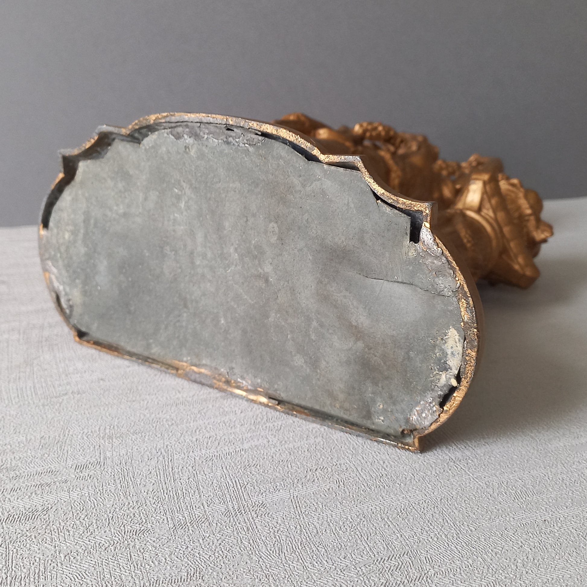 État : bon état ancien, solide, avec des traces d'usure liées à l'âge, comme des éclats sur la finition or/bronze et des signes indiquant que la figurine a probablement été repeinte à un moment donné de sa vie. En dessous et hors de vue, il y a une petite fente dans la plaque de base en métal