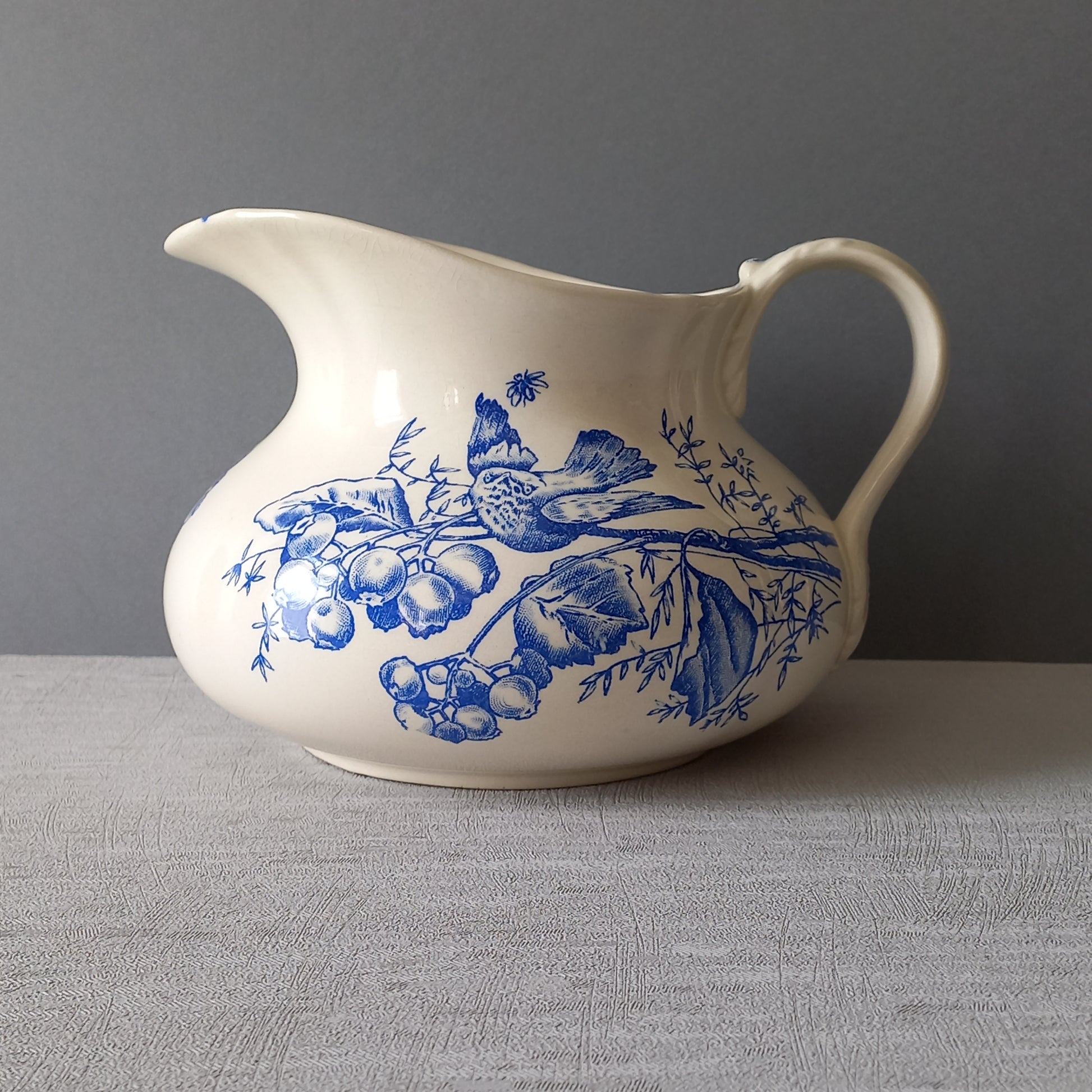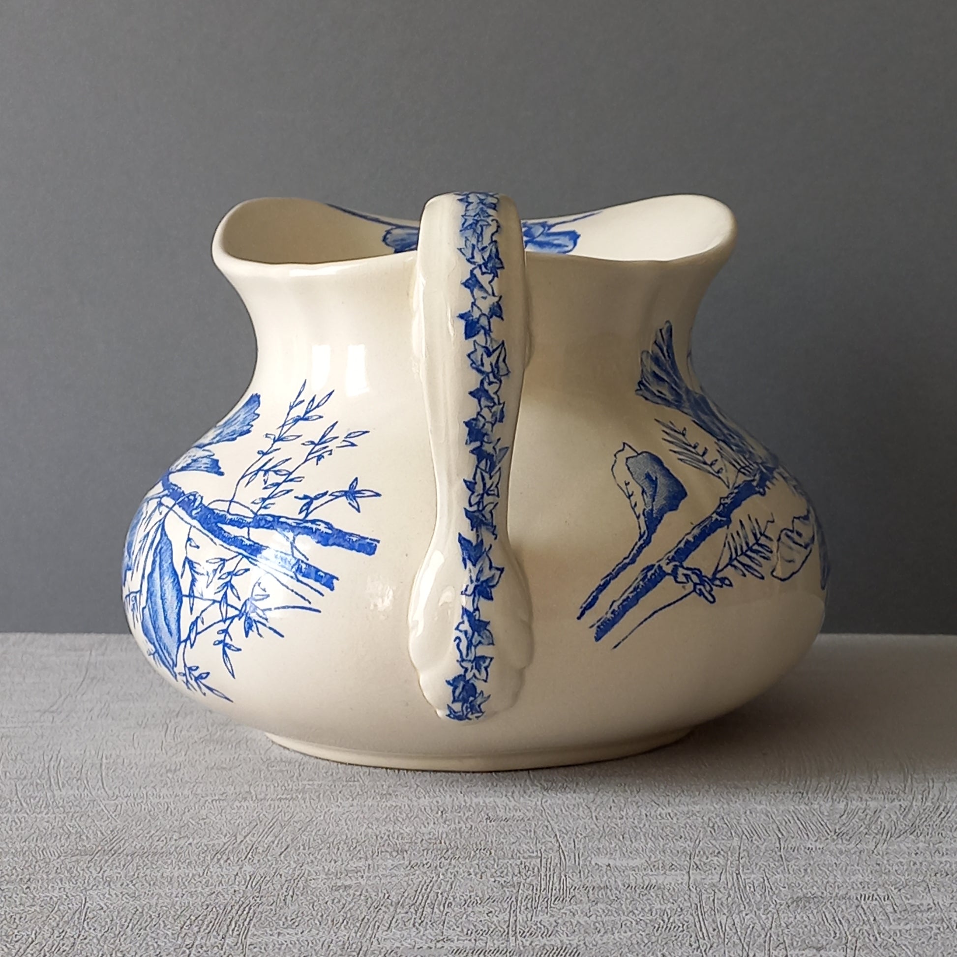Pichet ancien français en terre de fer, blanc, avec motif d'oiseaux bleus et de fleurs. Autrefois utilisé pour contenir l'eau et la verser dans un bol pour la toilette, il constitue aujourd'hui un superbe objet de décoration. Il porte la marque du fabricant HB and Cie. Vers la fin du XIXe siècle et le début du XXe siècle.