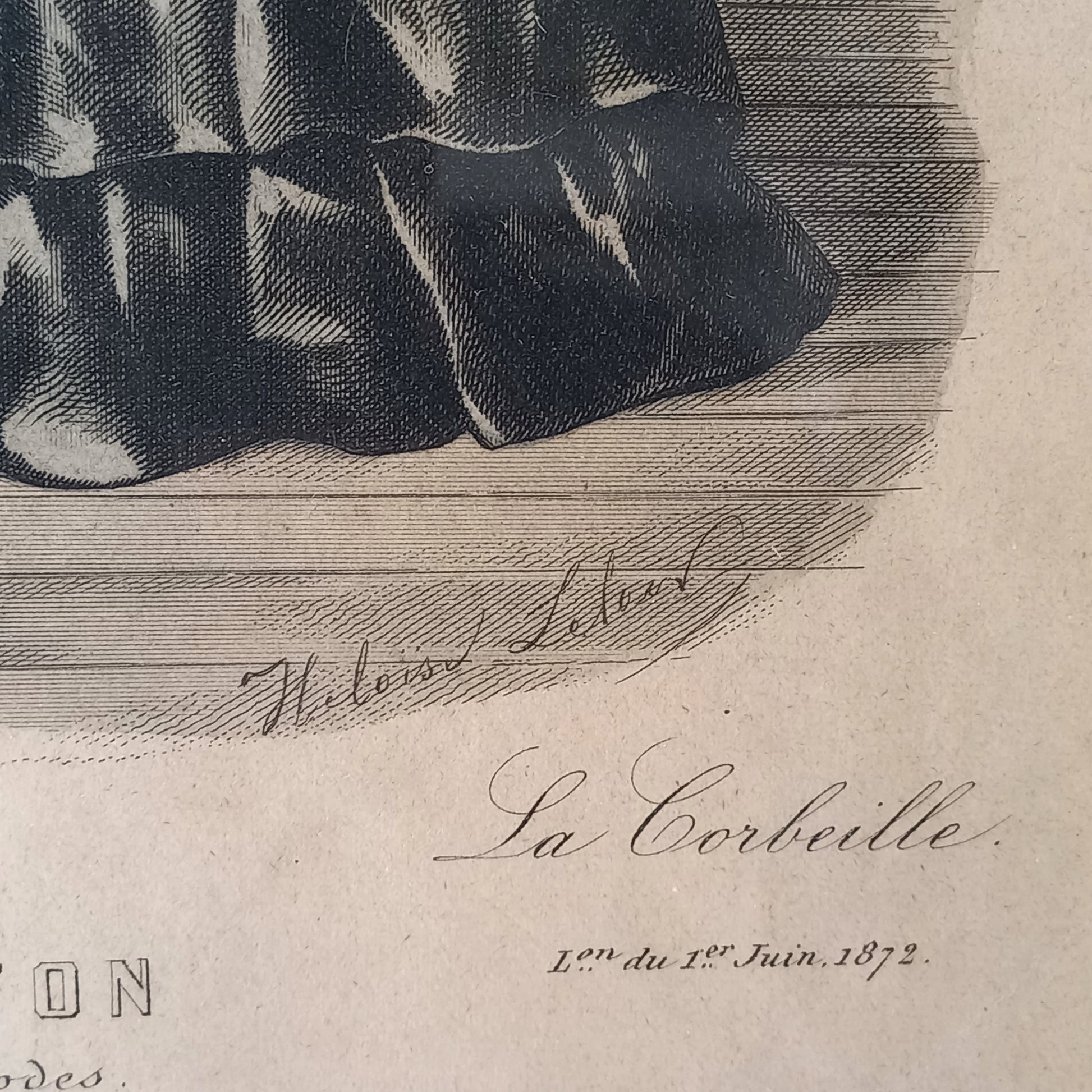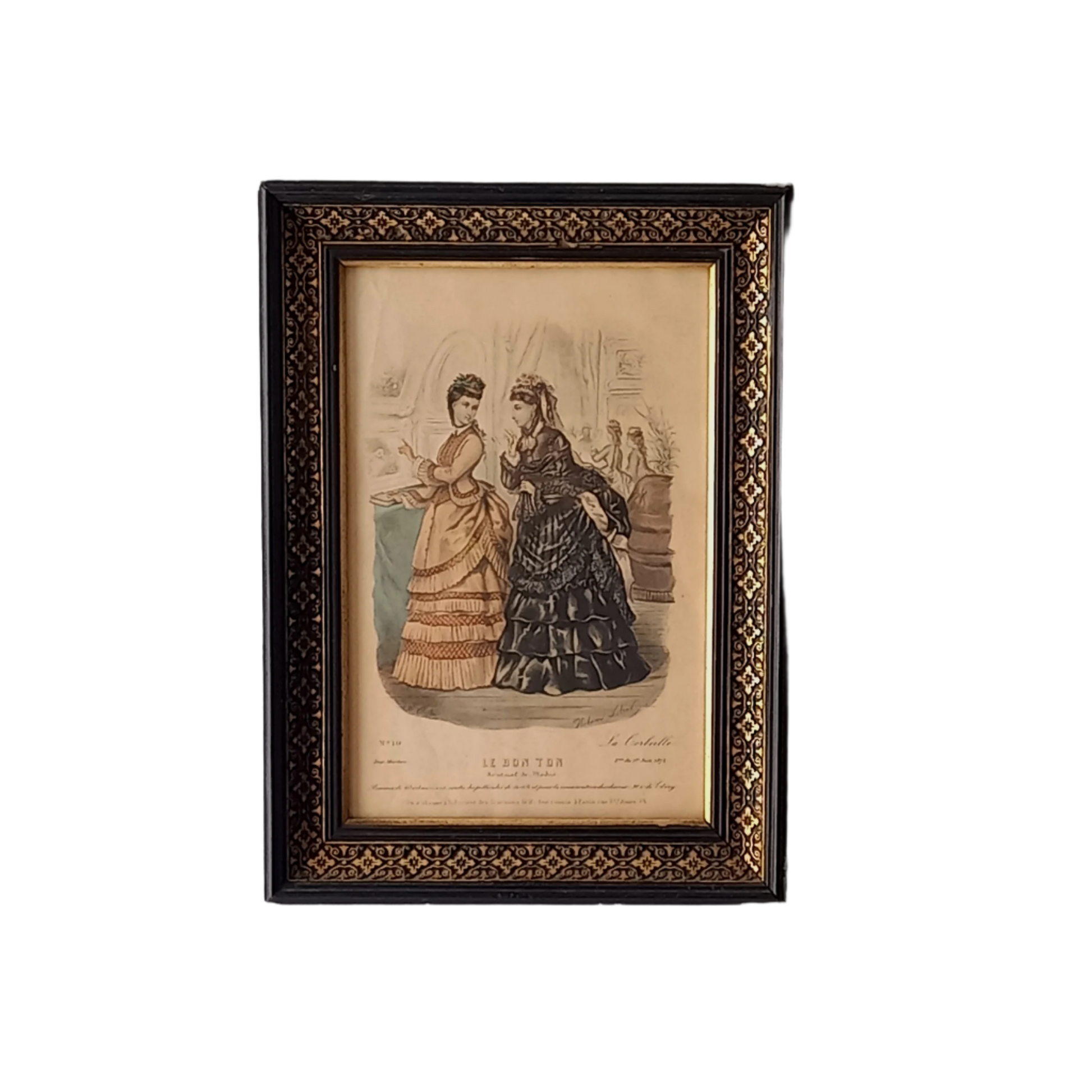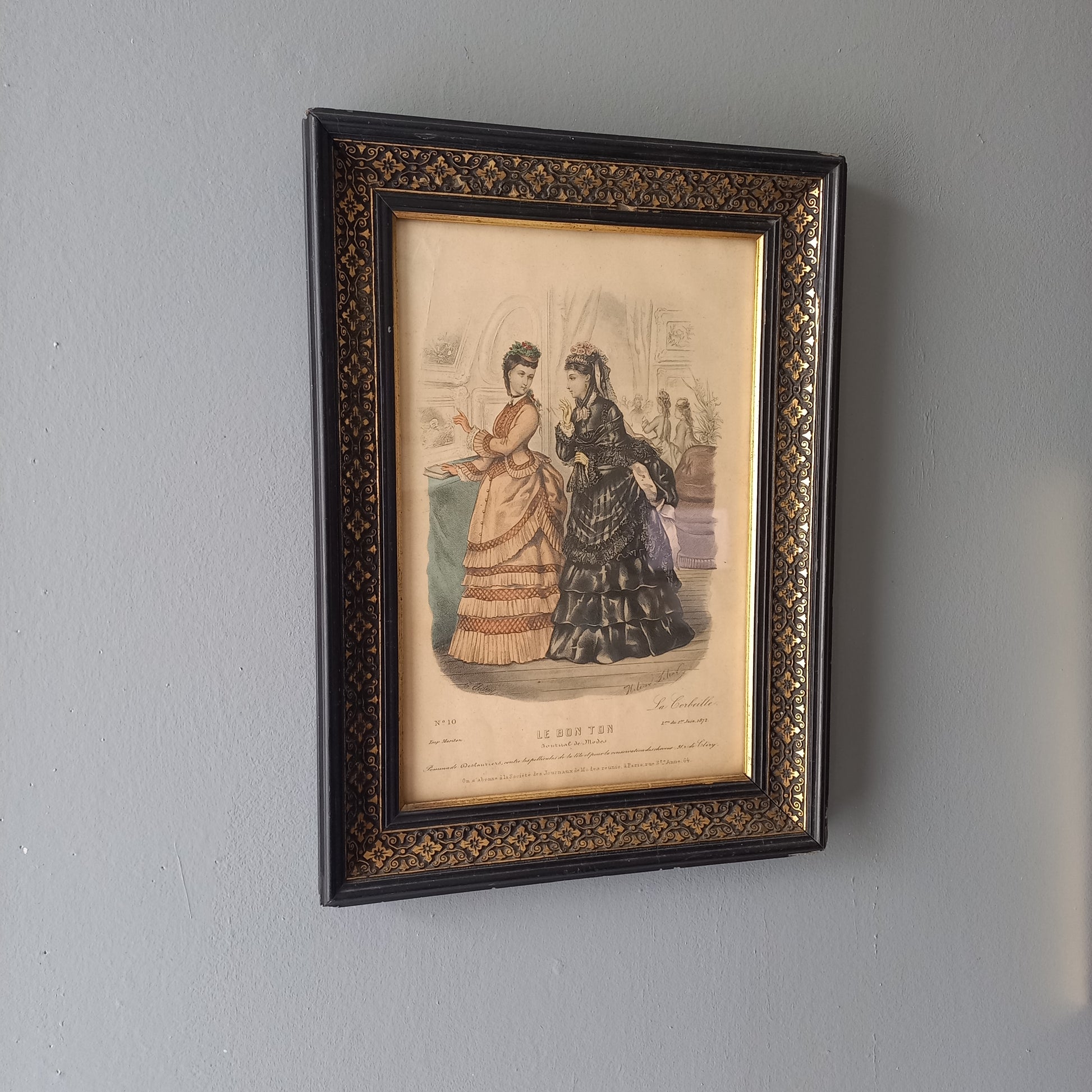 Superbe gravure de mode ancienne représentant la haute couture féminine française de la fin du XIXe siècle (1872). Présentée dans un magnifique cadre ancien en bois noir et or, elle est dotée d'une vitre. Une pièce absolument magnifique.