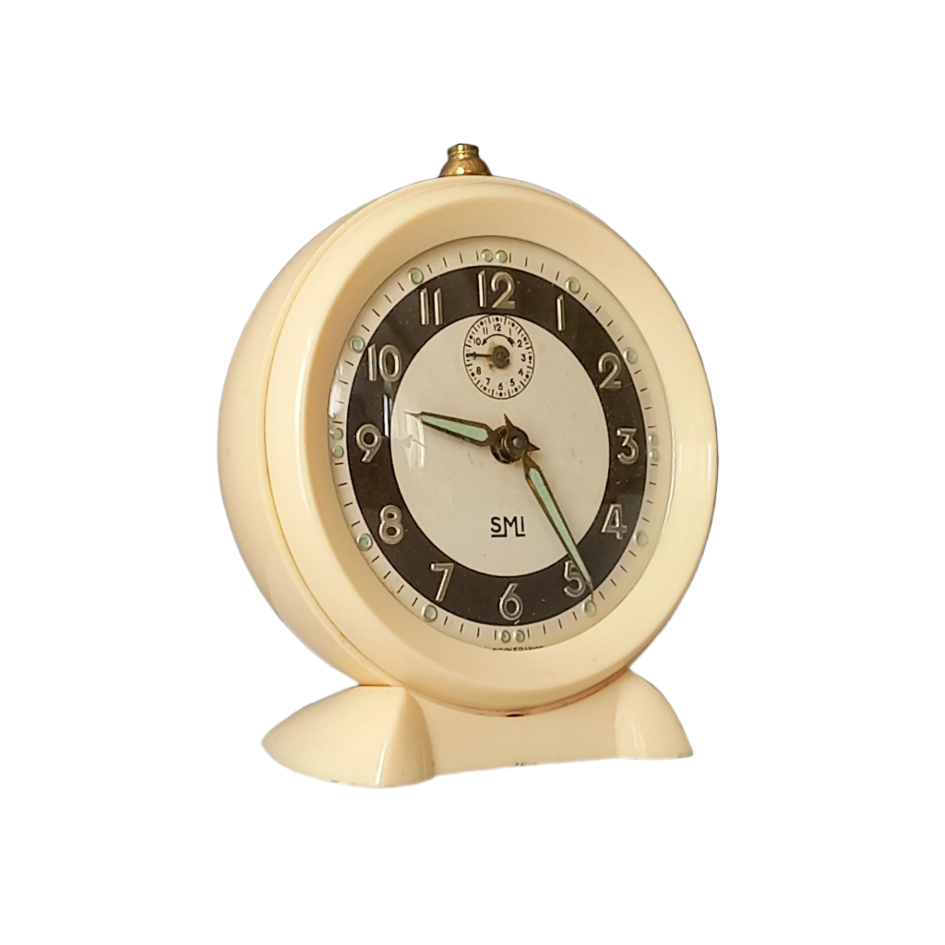 Un réveil vintage élégant dans une jolie teinte crème avec un style art déco du fabricant français SMI.