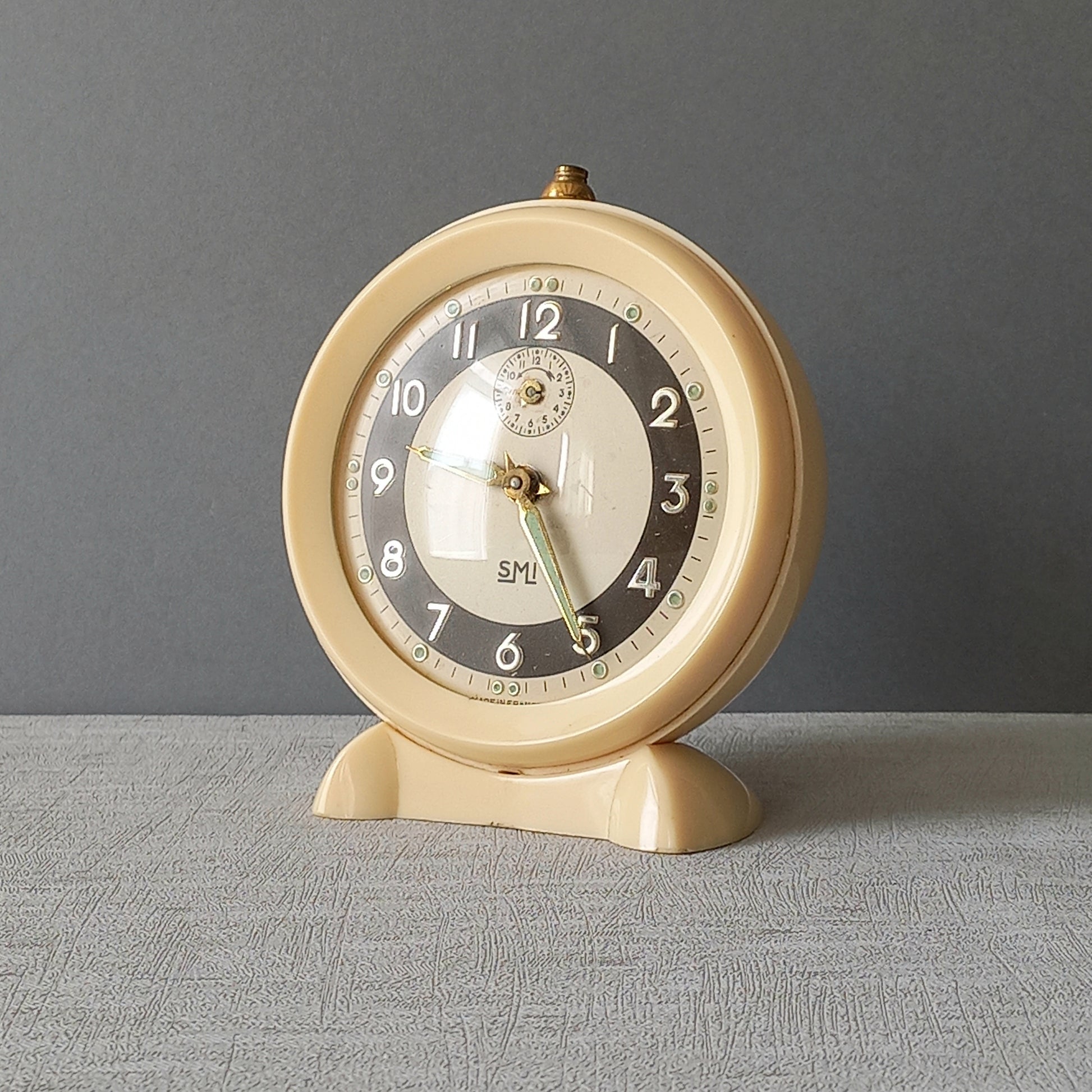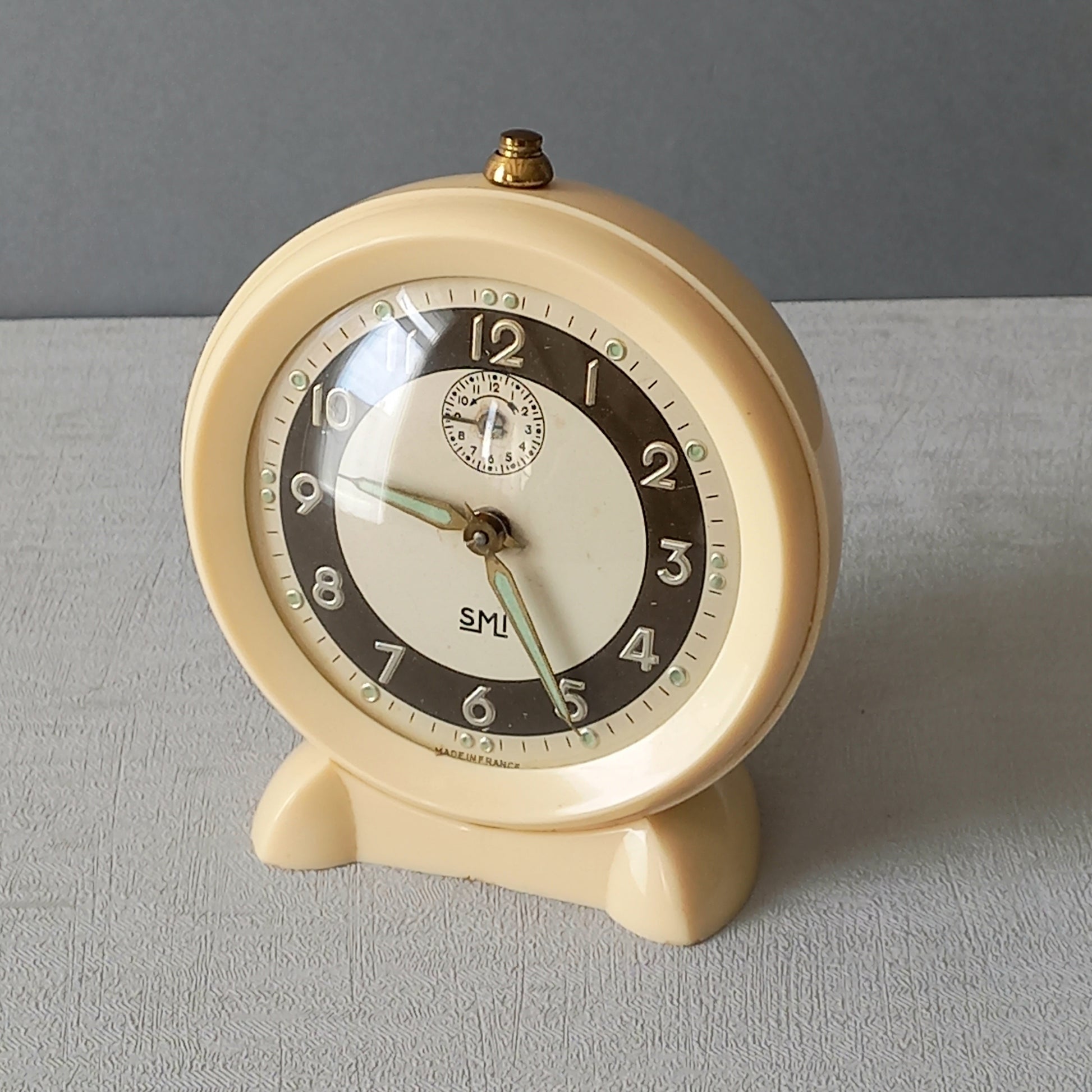 Réveil vintage crème français par SMI, horloge mécanique art déco