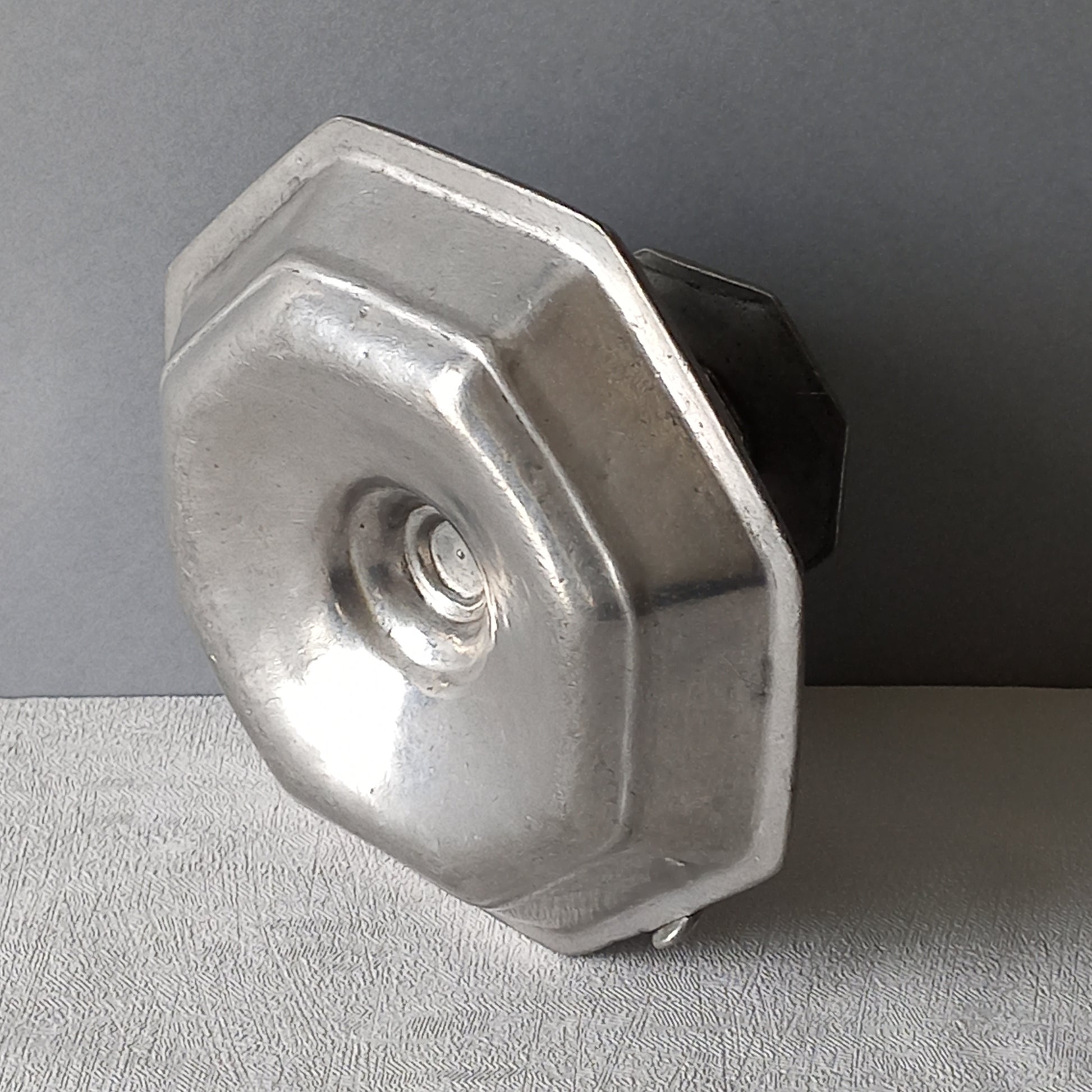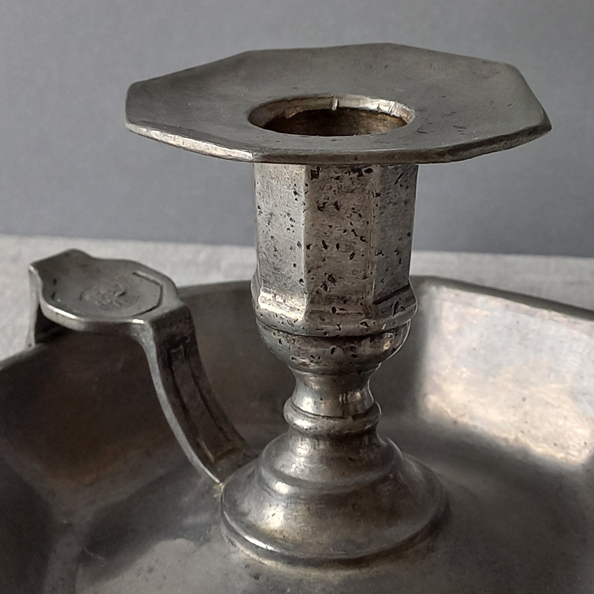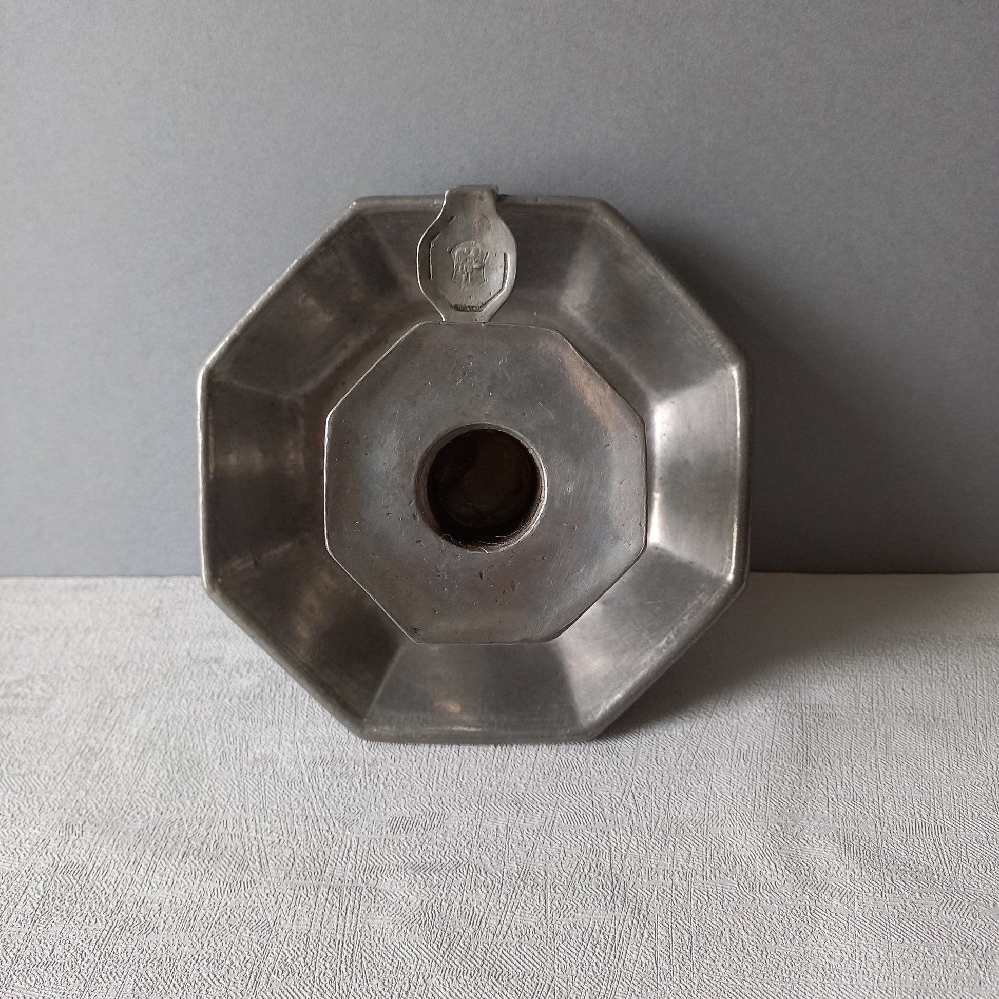 Élégant bougeoir ou chandelier vintage français en étain, de style Art déco/moderniste. La poignée porte la marque du fabricant (voir photo 4).