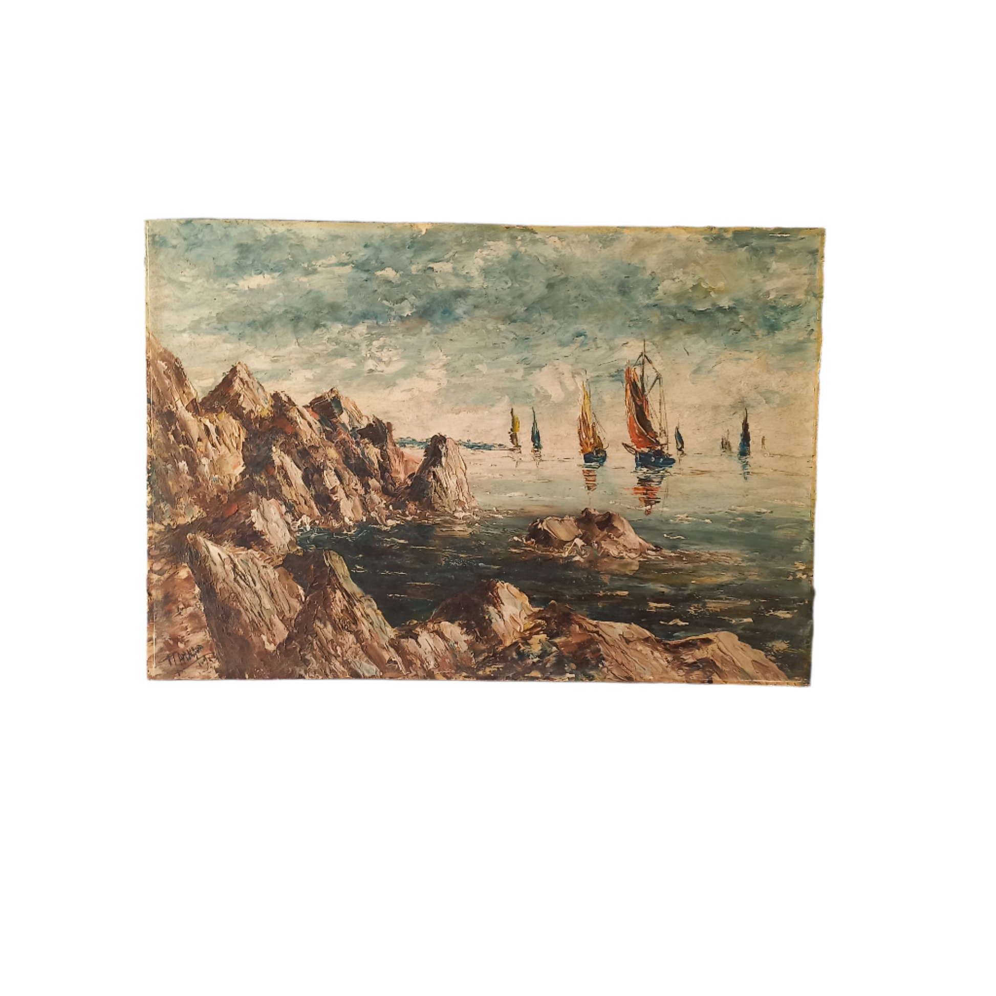 Magnifique œuvre d'art originale française représentant des voiliers sur une côte rocheuse. Le tableau est magnifiquement réalisé dans un style pictural, avec des touches épaisses et vibrantes de peinture à l'huile sur panneau dur. Il est signé et daté par l'artiste.