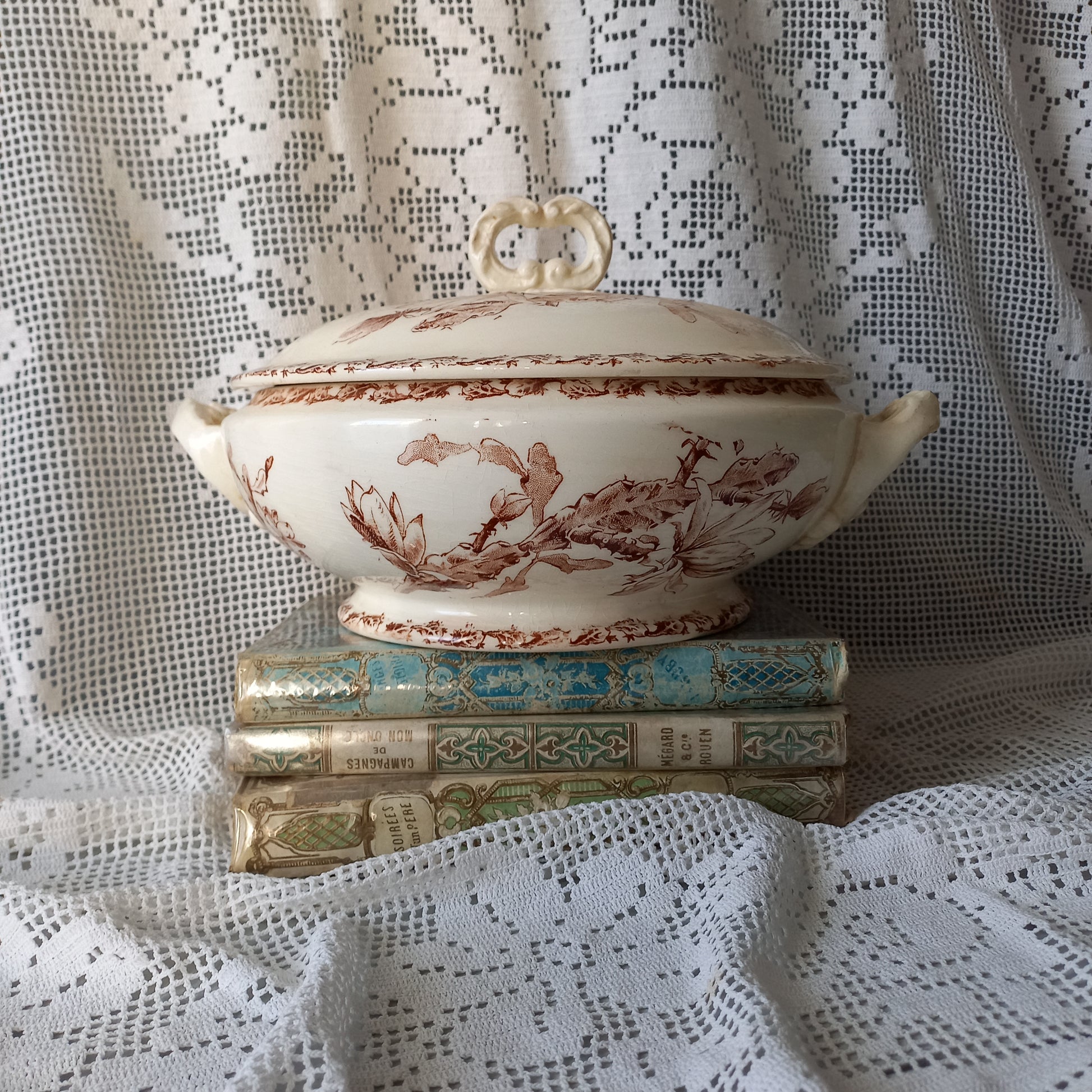 Petite soupière ancienne en terre de fer, d'un magnifique blanc crème à motif sépia. Le fabricant français s'appelle Gien et le motif est « Cactus ».