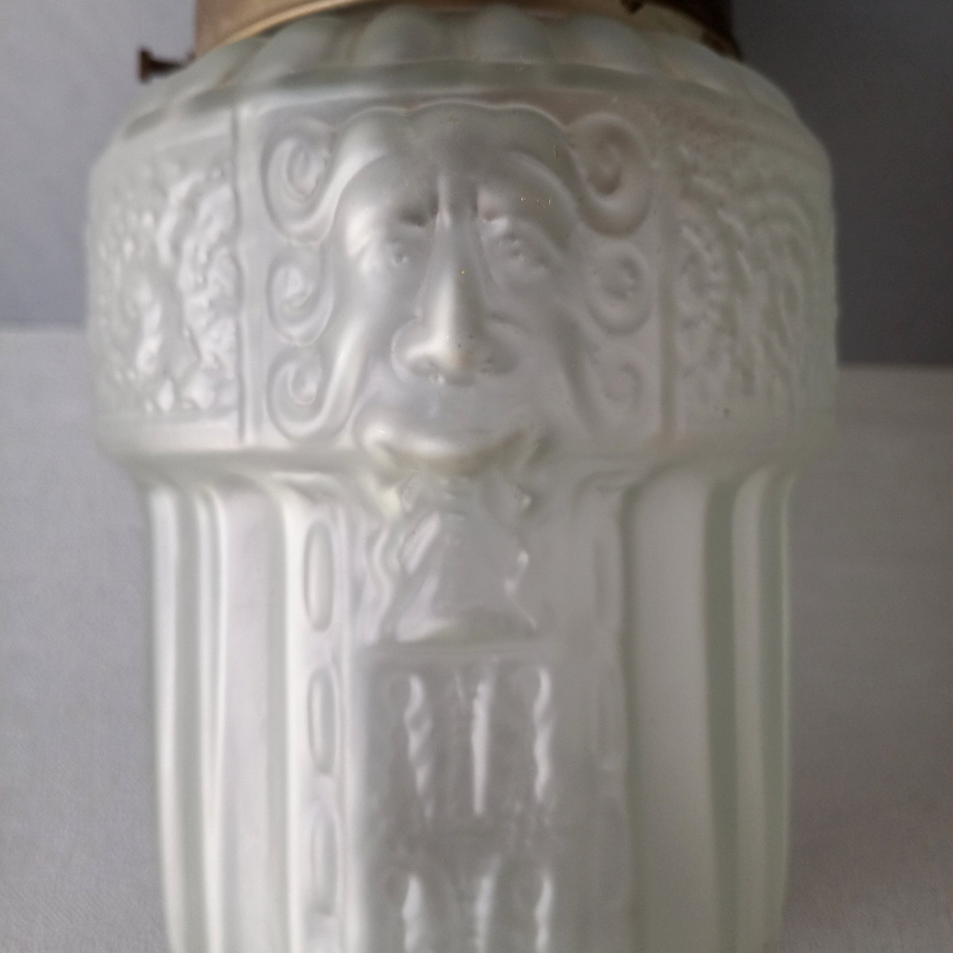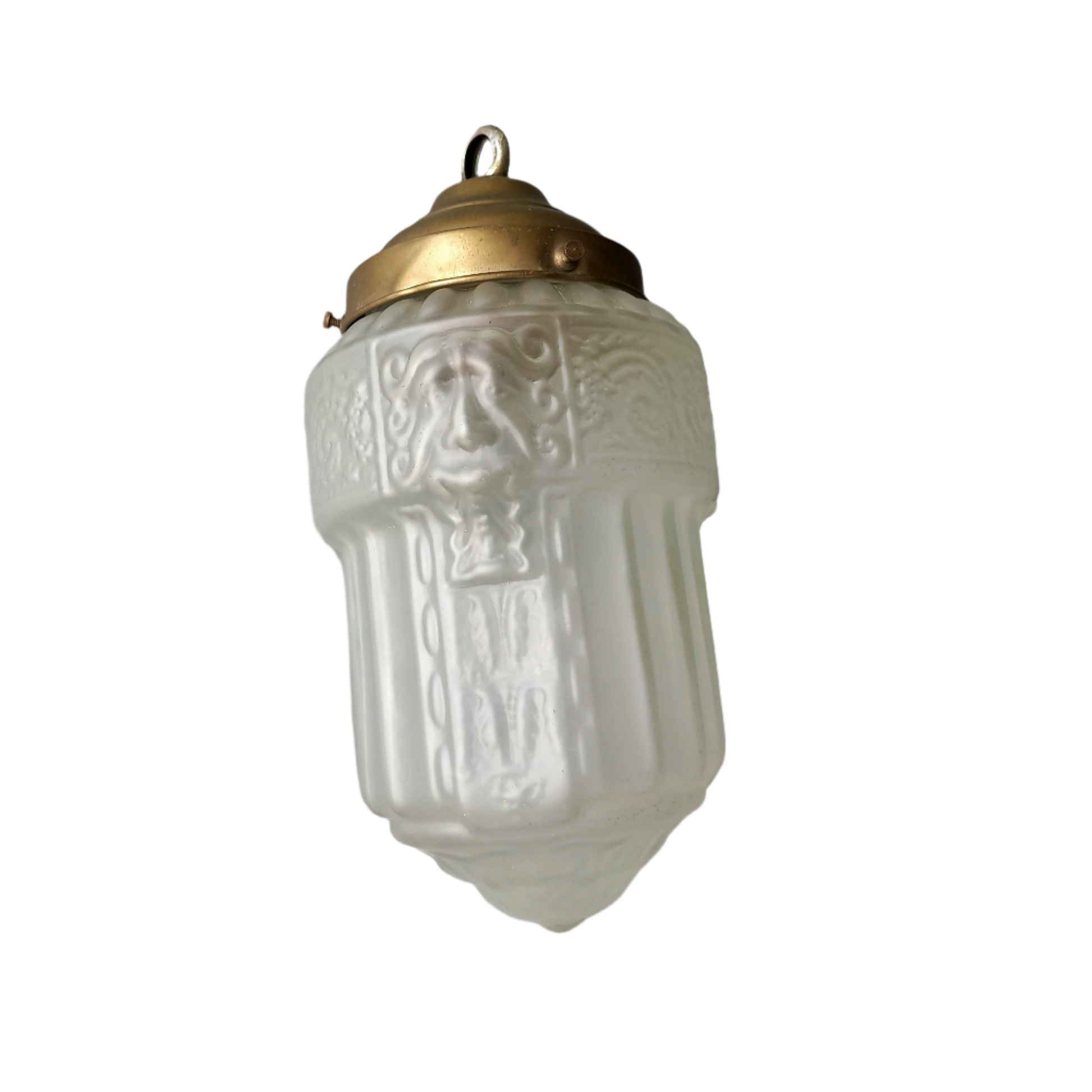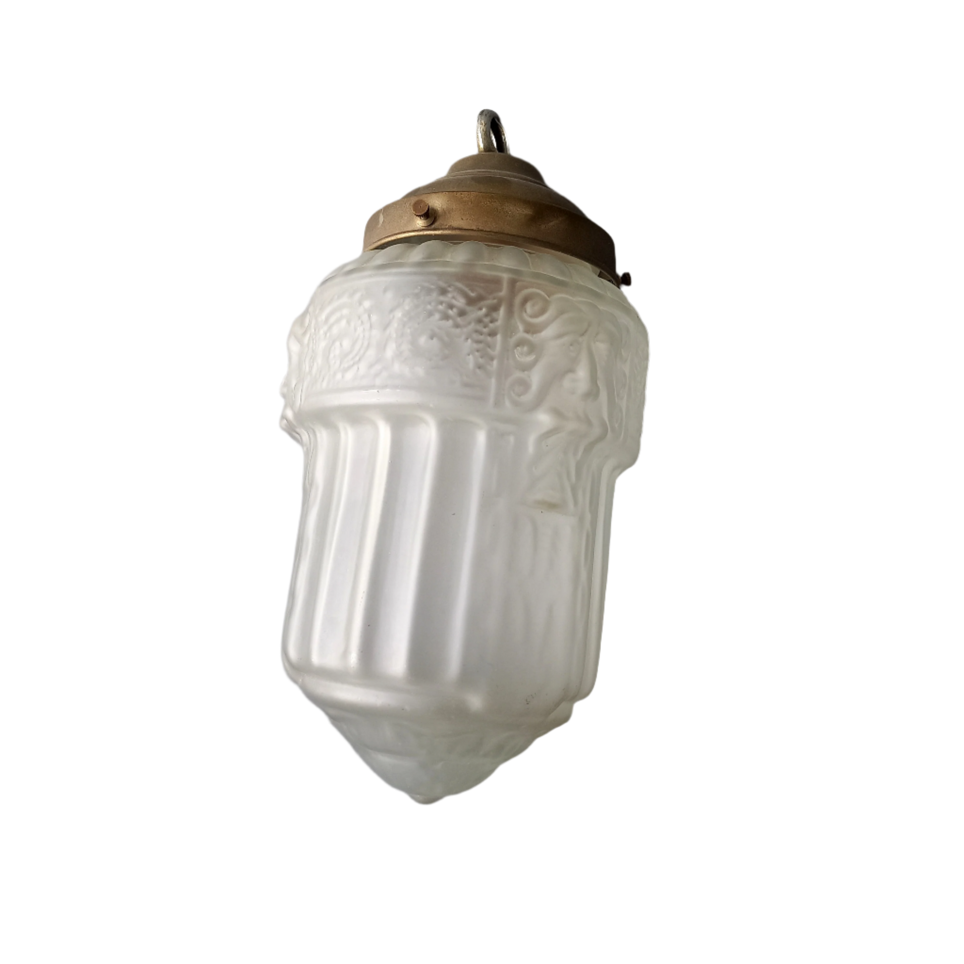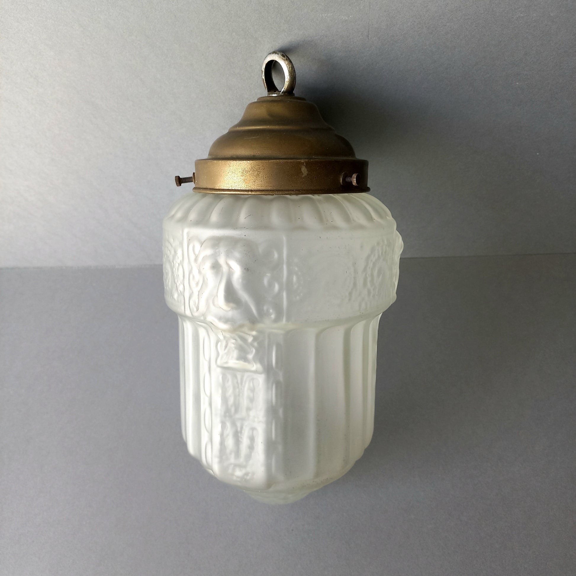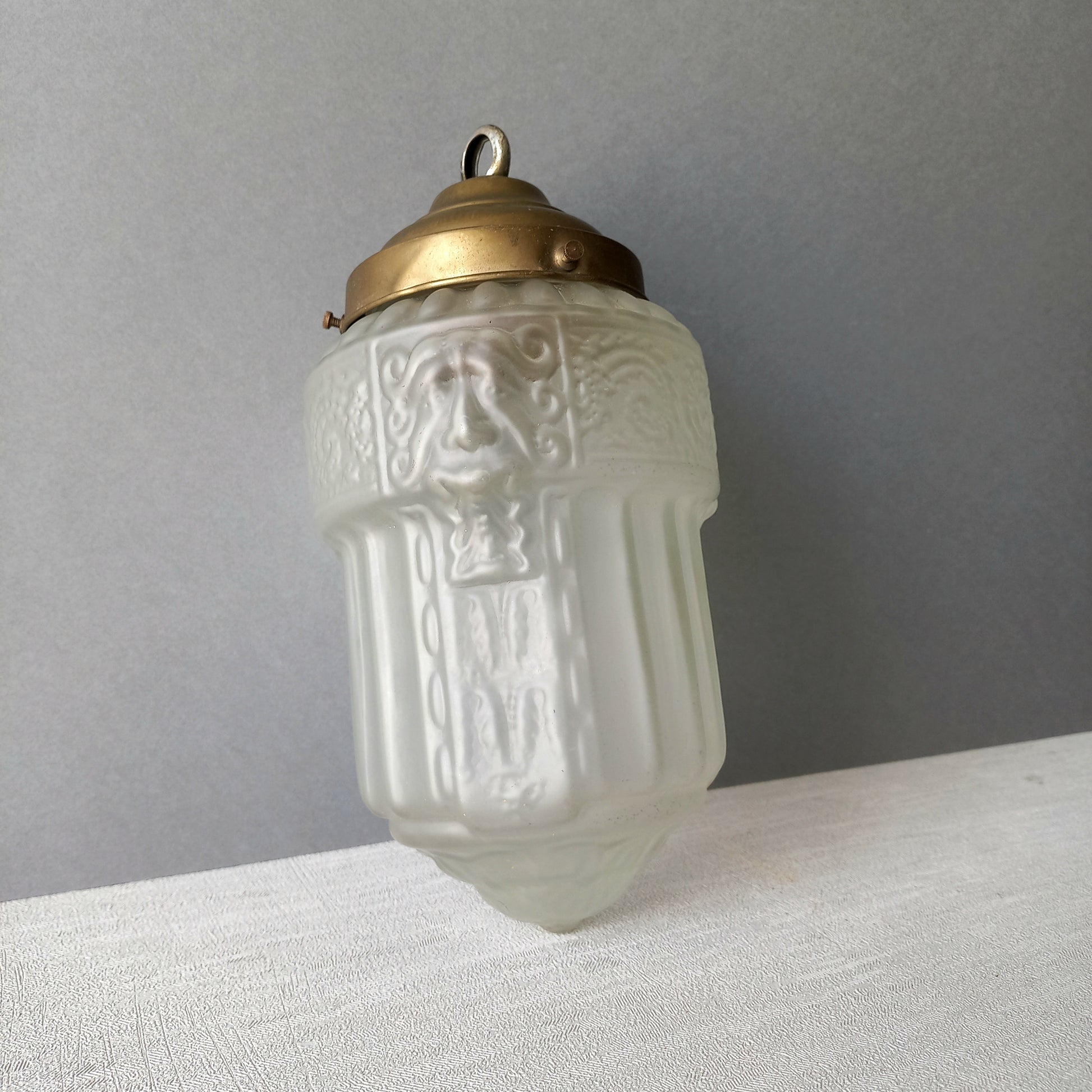 Une superbe lampe suspendue Art déco française antique avec abat-jour en verre dépoli avec des motifs décoratifs et des visages en relief - un petit morceau d'histoire vraiment merveilleux et pratique.