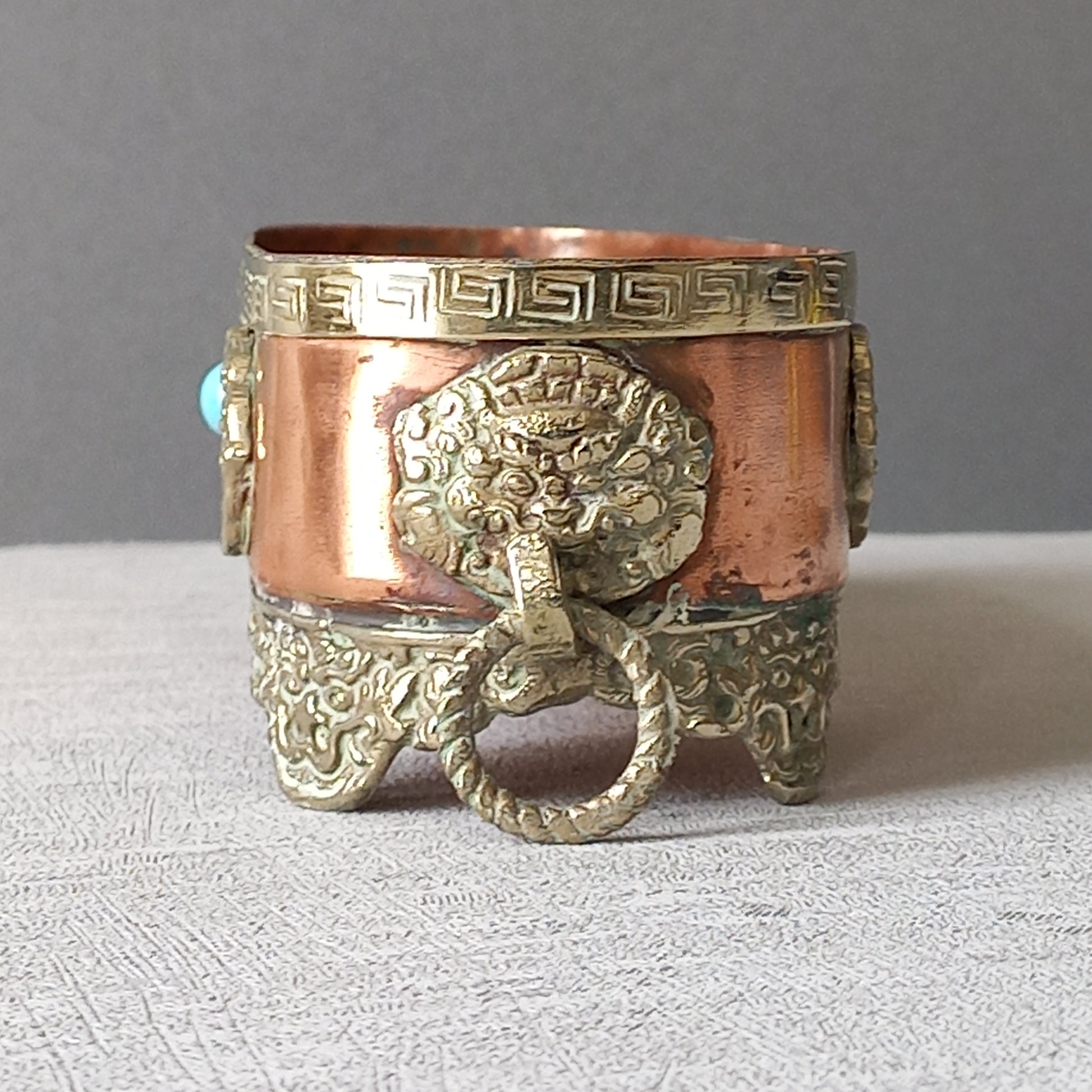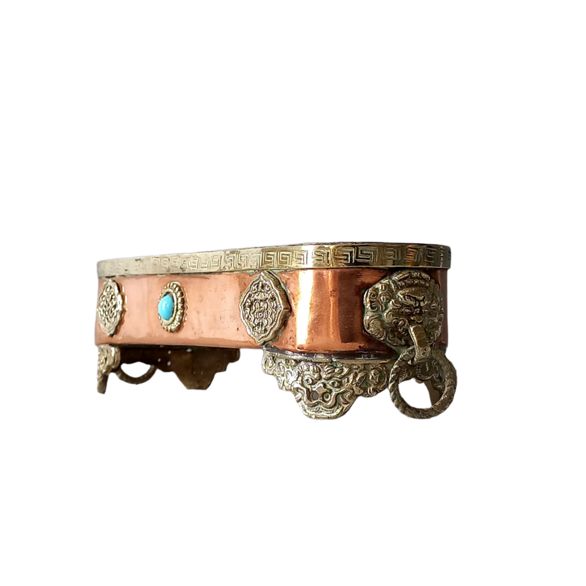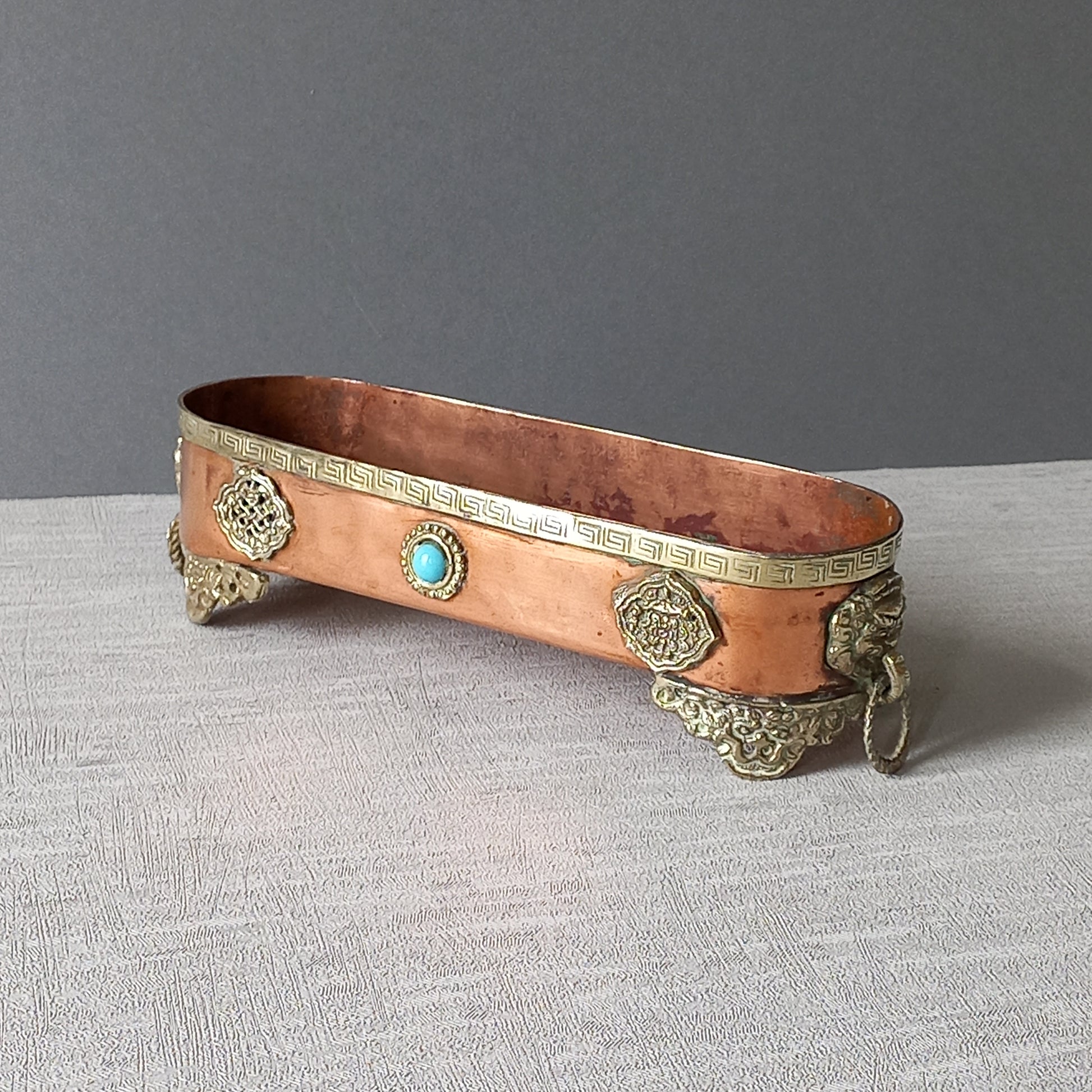Petit plateau décoratif vintage/antique en cuivre sur pieds en laiton avec détails en laiton et pierres de couleur turquoise - Asiatique/Moyen-Oriental dans sa conception/apparence.