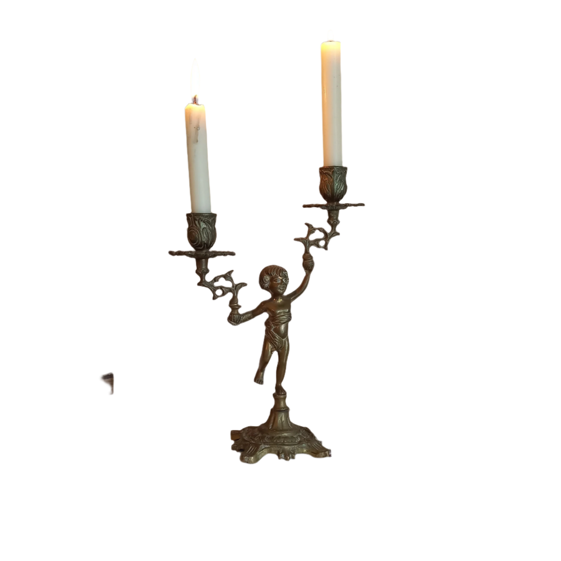 Un bougeoir chérubin vintage en laiton français pouvant accueillir deux bougies. Cette pièce décorative lourde constituera un décor accrocheur dans n'importe quel intérieur. Veuillez consulter les dimensions et les détails de l'état ci-dessous.