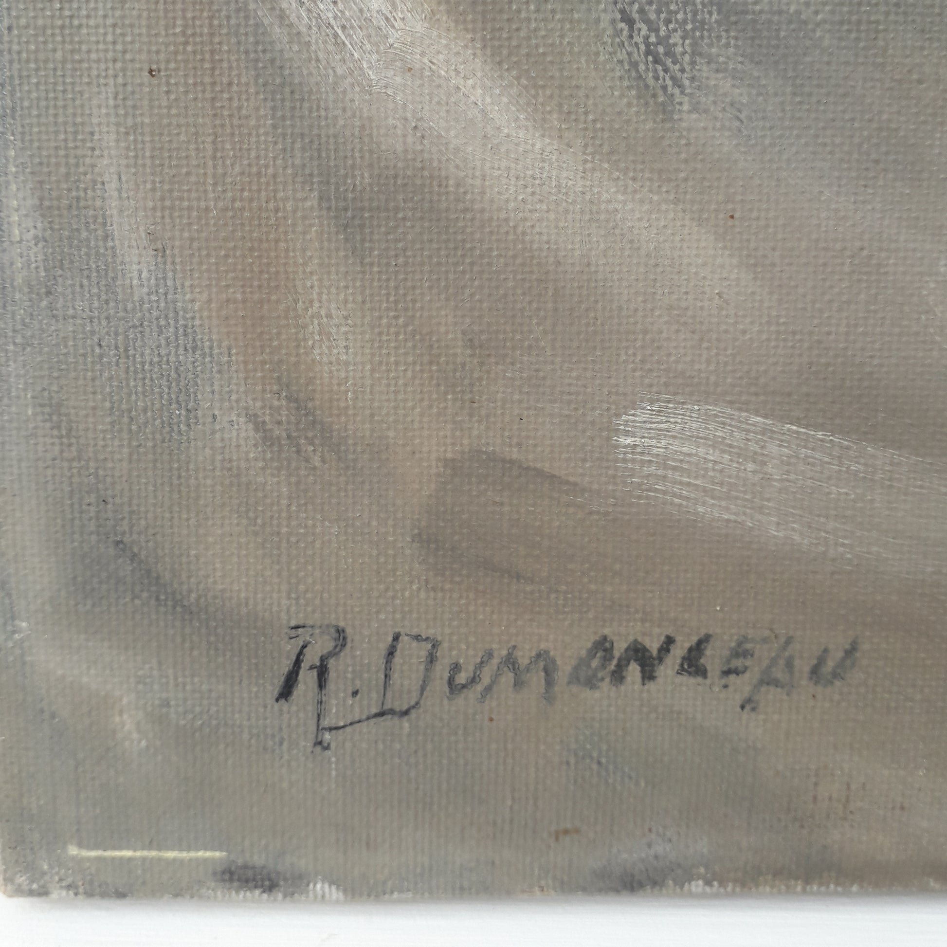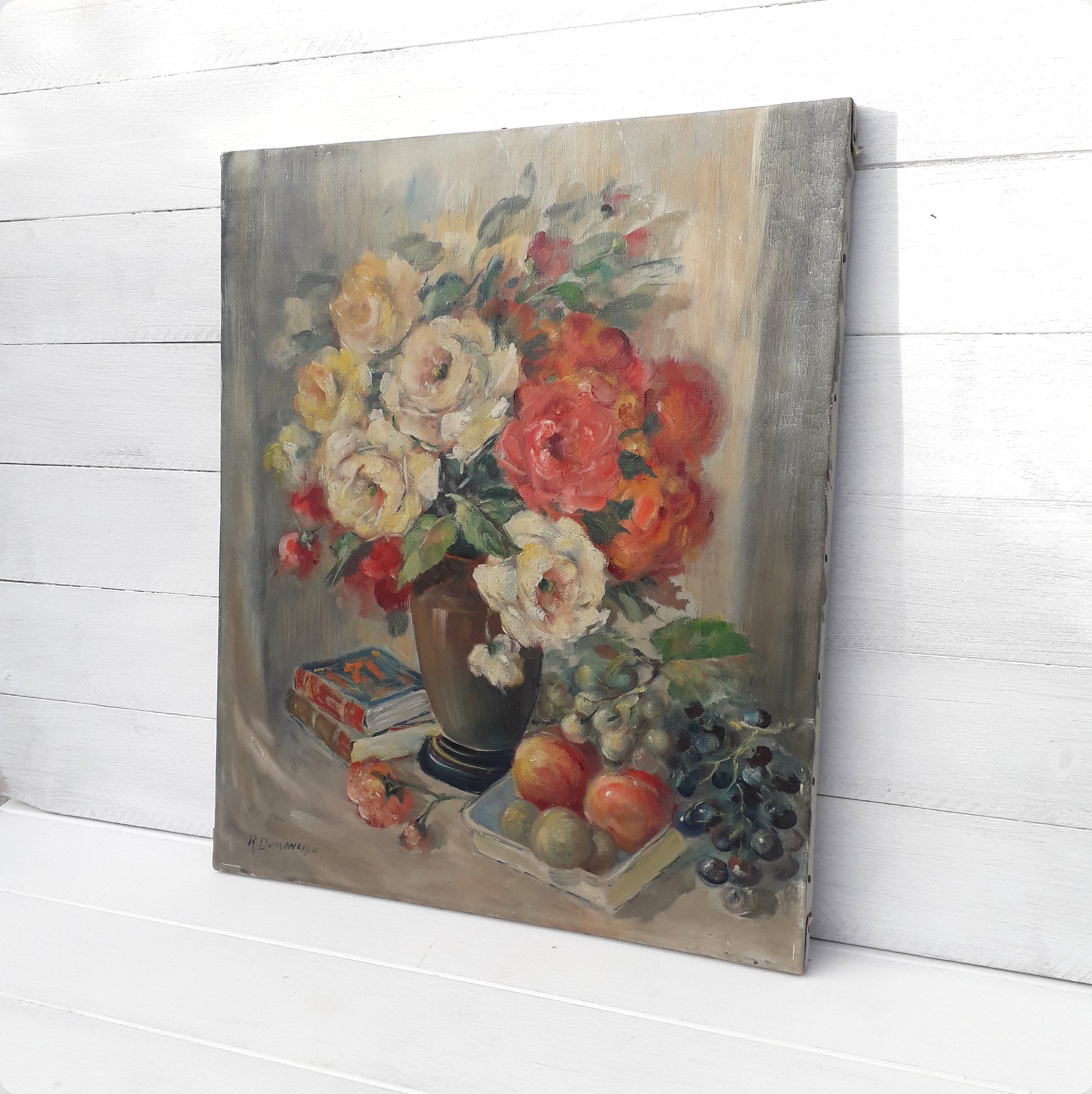 Magnifique nature morte française vintage, achetée en Belgique. Réalisée sur une grande toile tendue, elle est signée, semble-t-il, R. Dumonceau. D'après le marchand chez qui je l'ai achetée, elle date des années 1920-1930. Le tableau n'est pas encadré, mais il est muni d'une boucle de suspension à l'arrière pour pouvoir l'accrocher au mur.