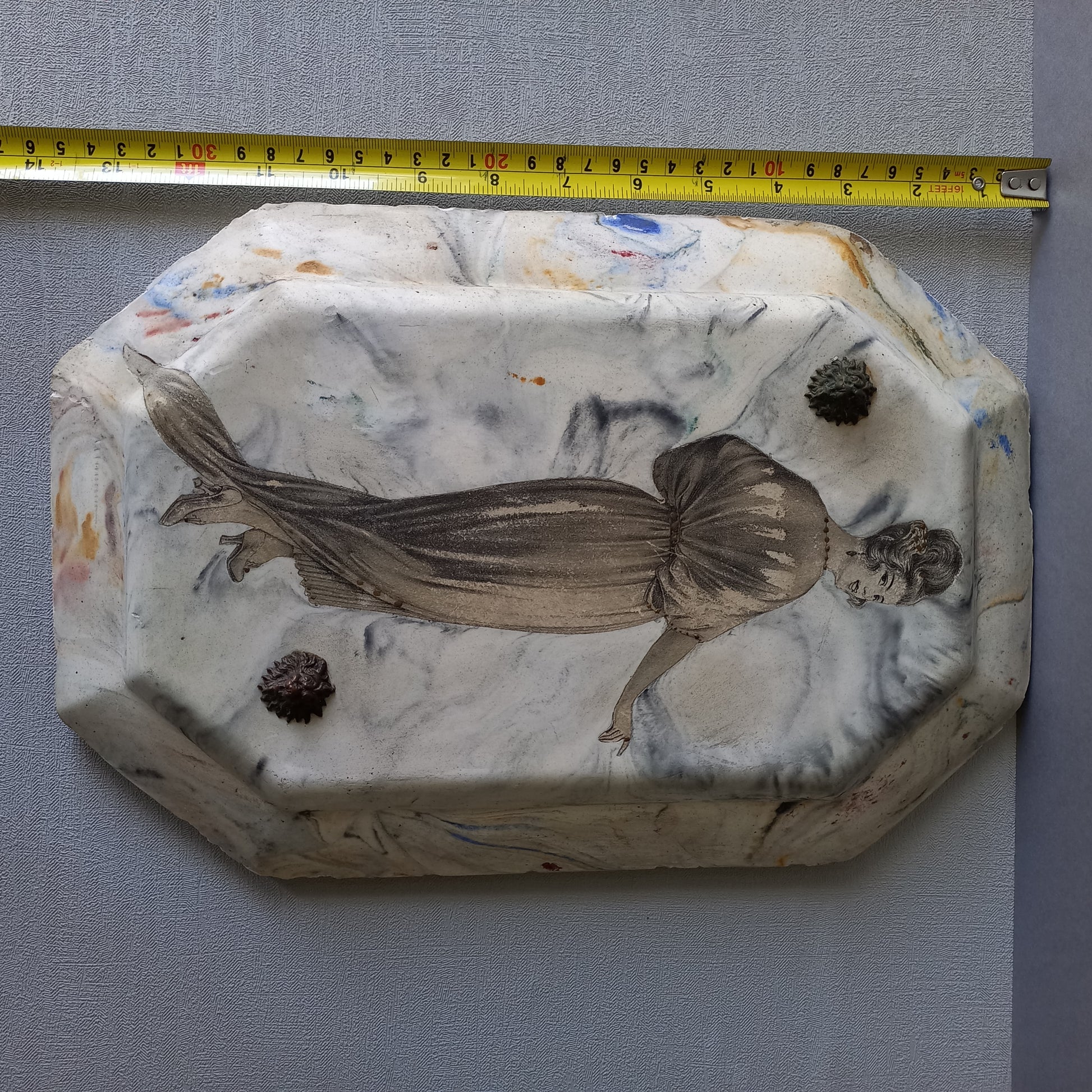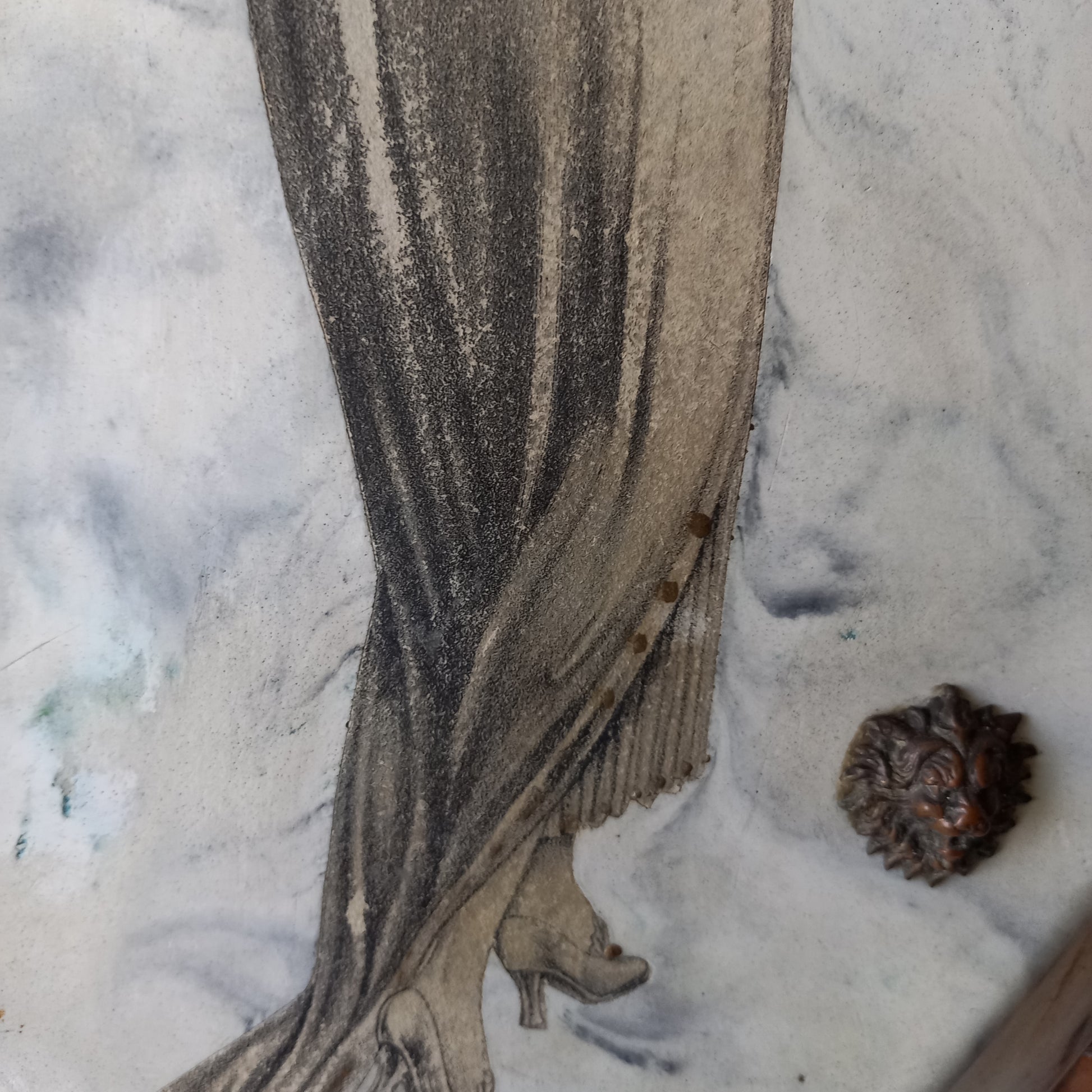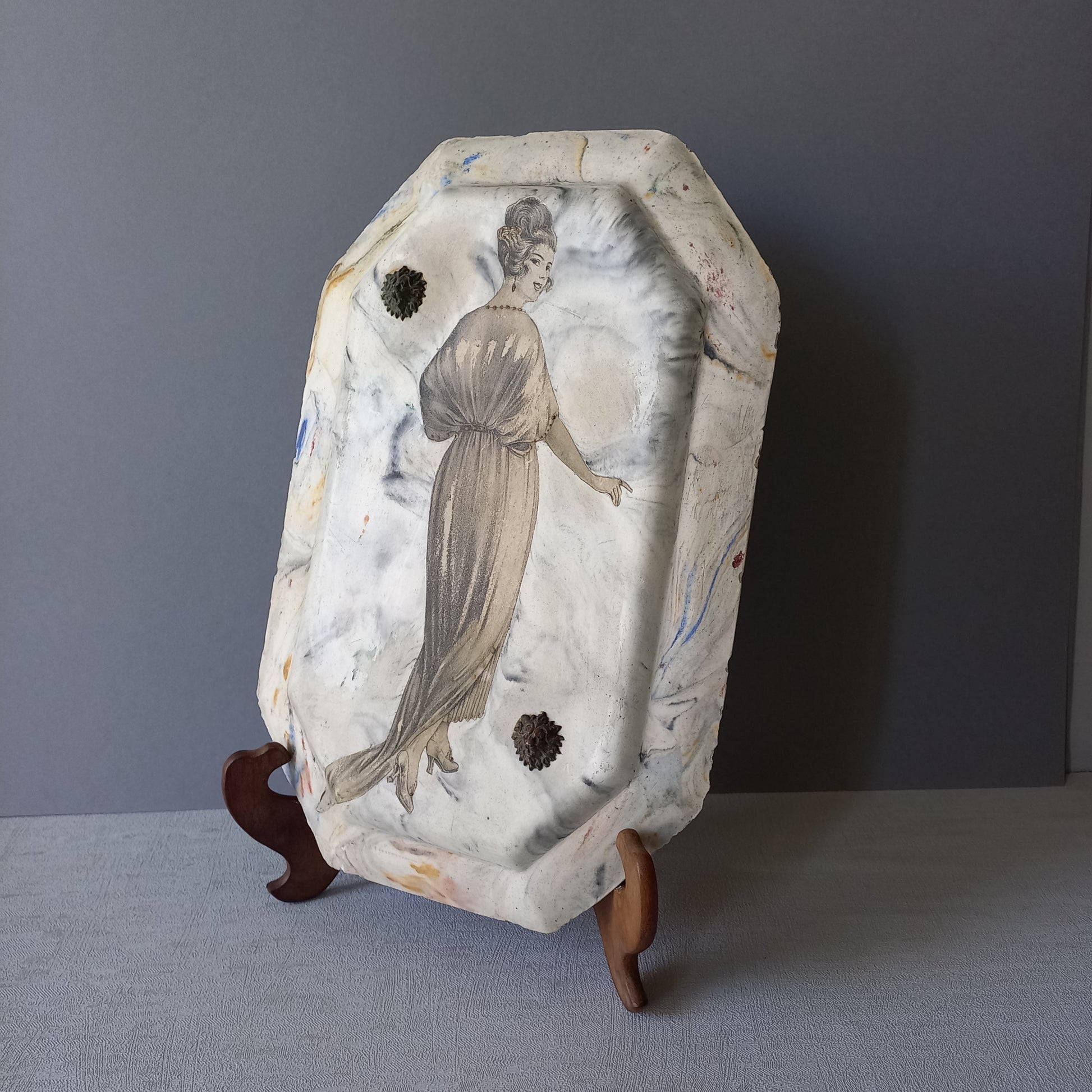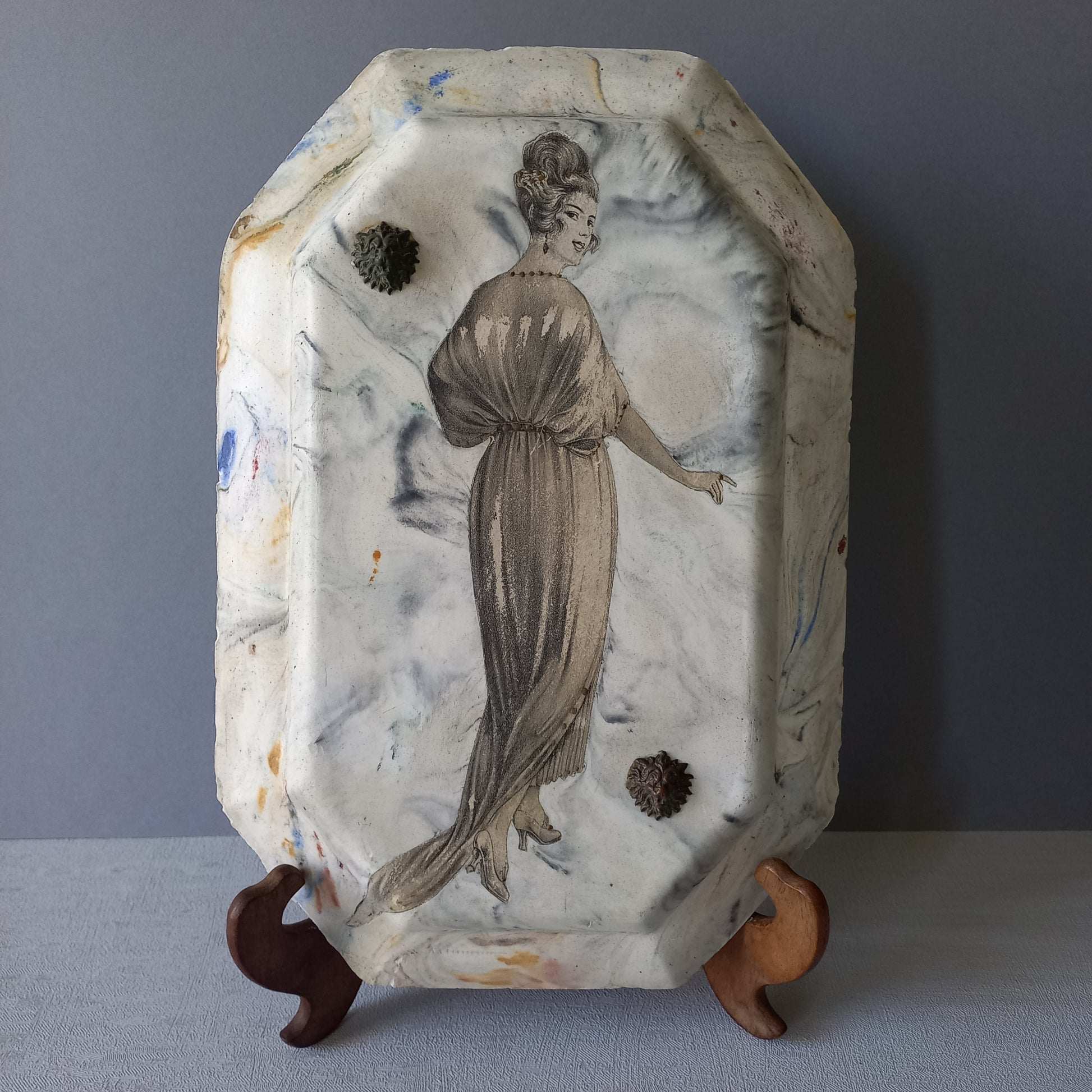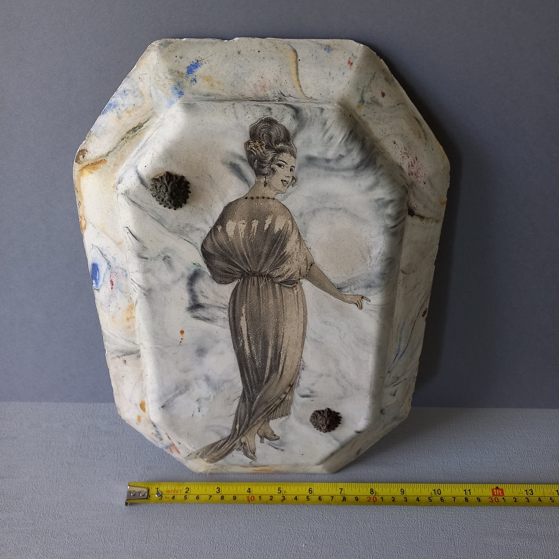 Unique piece of French vintage/antique hand-made wall art depicting an attractive woman in early 20th century period dress with hand-painted details. We think this piece was possibly made by a clever hand-crafter back in the day, perhaps using an antique illustration of a woman and then adding little details such as the necklace with little blobs of paint - there are two metal lions' heads details fitted into the plaster or terracotta base which has an attractive marble effect. To the rear is some string for hanging the art. A really splendid and unusual piece indeed!